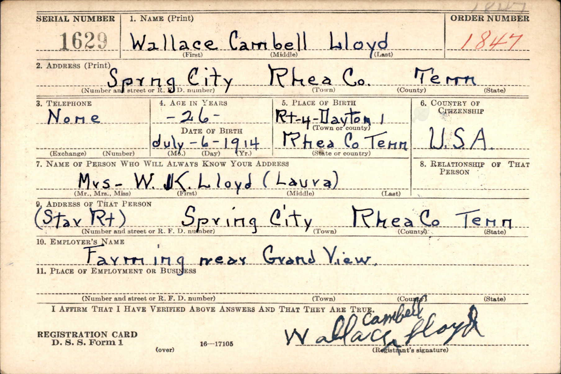 Wallace Campbell Lloyd was born 6 July 1914, the son of William King Lloyd and Laura Tennessee Housley.
