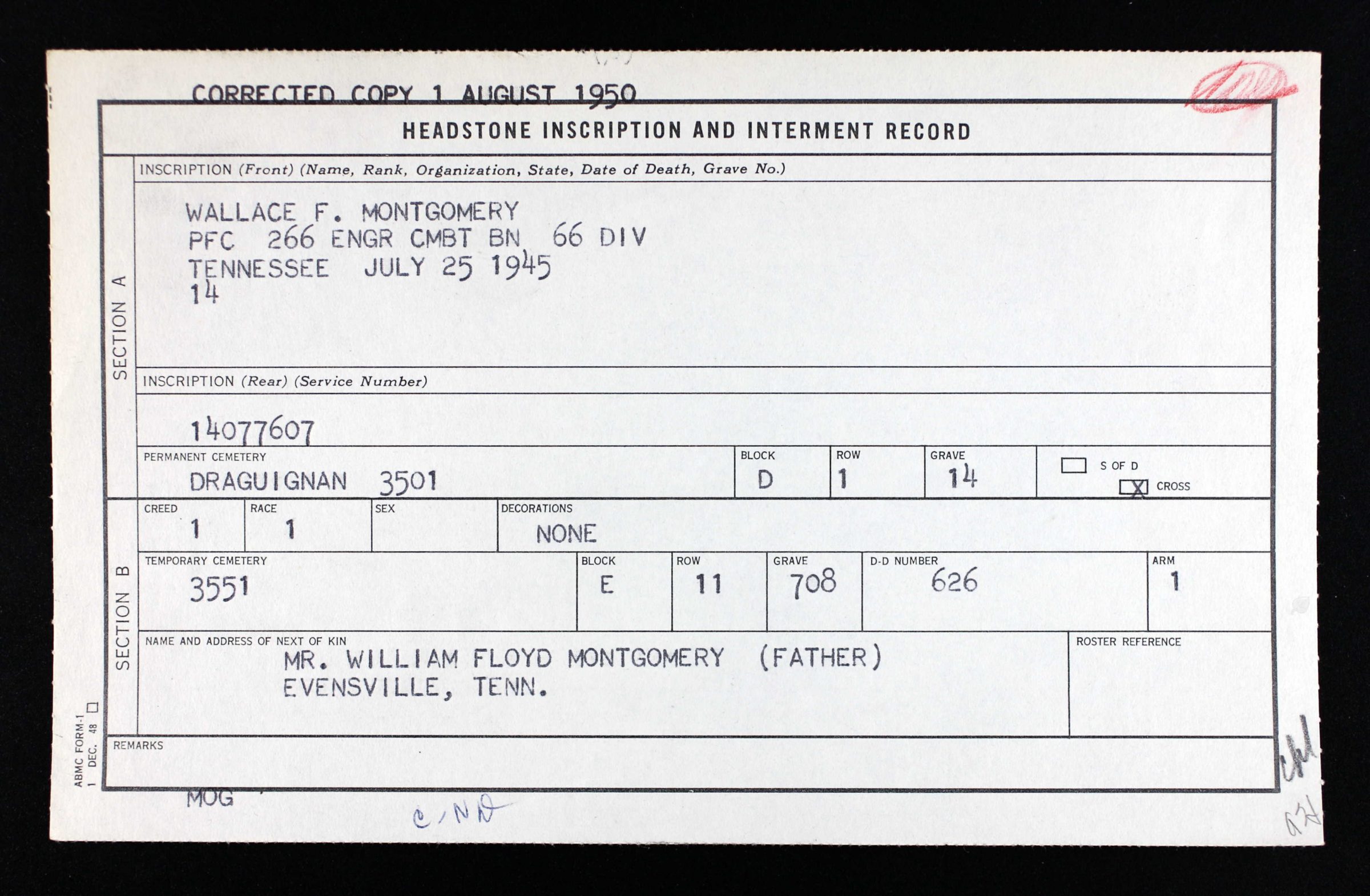 He was initially buried at Luynes Cemetery at Aix-En-Provence, France, and reburied at Draguignan (Var), France, D, 1, 14\