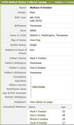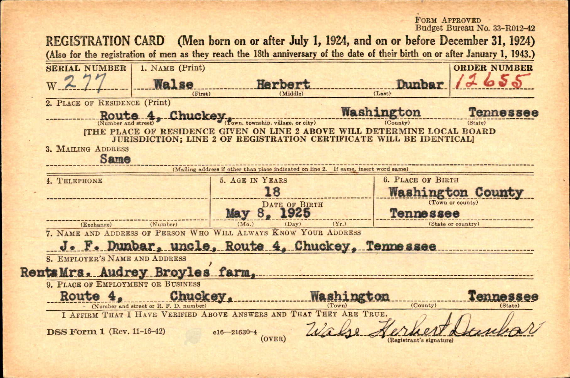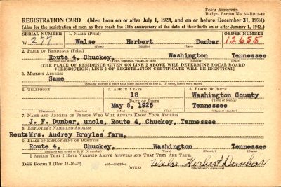 Walse (or Wallace) Herbert Dunbar was born in Washington County, Tennessee, the son of Mack Fieldon Dunbar and Vina Ethel McInturff. Husband of Audrey Jewell Broyles. Brother of Hays B. Dunbar, Minnie Allice (Dupes) Dunbar, Texie Mae (Laws) Dunbar.