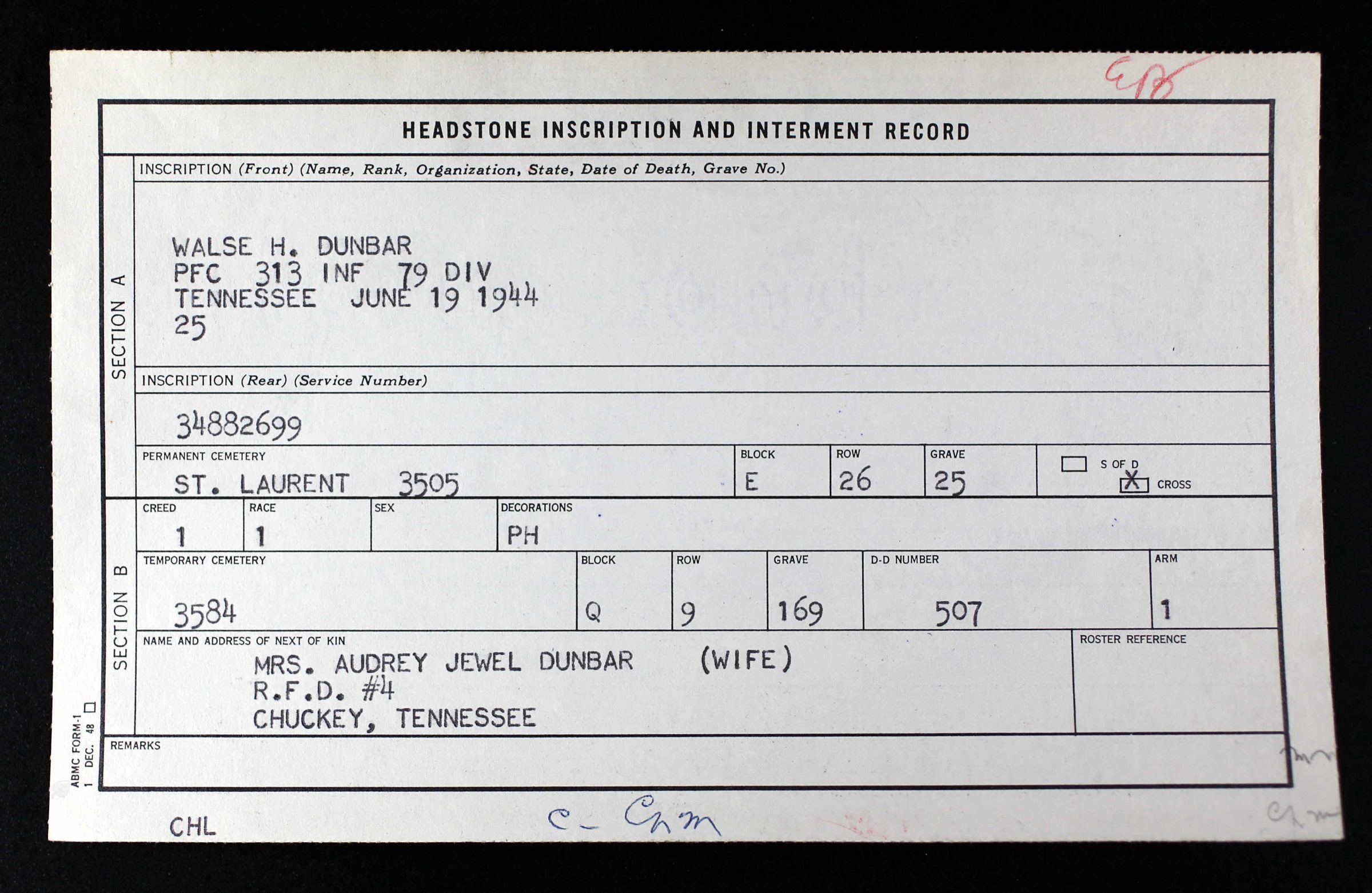 Enlisted on 7 August 1943 at Fort Oglethorpe, Georgia Killed in Action 19 June 1944 Hometown: Greene County, TN. Registered at Washington County, TN in the 1940 Census. Awarded the Purple Heart.