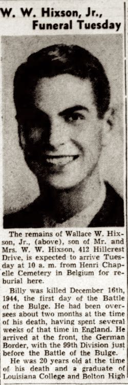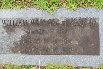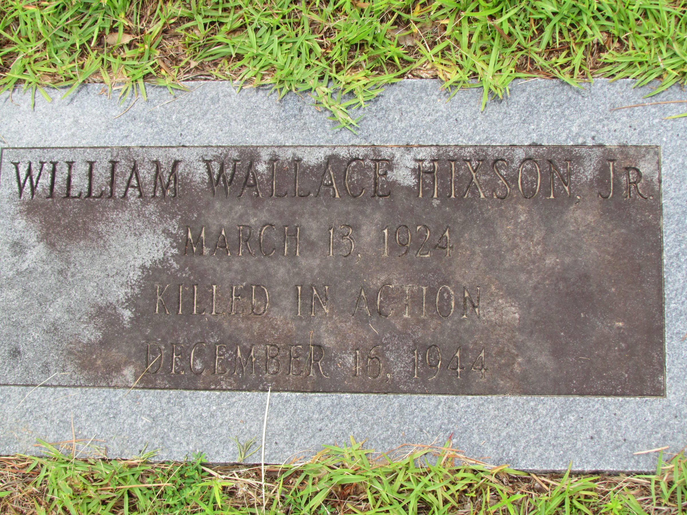 Wallace William Hixson Jr. was born on 13 March 1924 in Tennessee to Wiliam Wallace Hixson and Amelia Evelyn West. He enlisted on 10 December 1942 at Lafayette, Louisiana and was killed in action on December 16, 1944 during the Battle of the Bulge in Belgium.