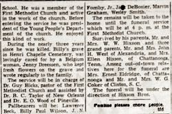 Billy was killed December 16th, 1944, the first day of the Battle of the Bulge. He had been overseas about two months at the time of his death, having spent several weeks of that time in England. He arrived at the front, the German border, with the 99th Division just before the Battle of the Bulge. He was 20 years old at the time of his death and a graduate of Louisiana College and Bolton High School. He was a member of the First Methodist Church and active in the work of the church. Before entering the service, he was president of the Young People’s Department of the church. He enjoyed this kind of work. During the nearly three years since he was killed, Billy’s Grave in Henri Chapelle Cemetery, was lovingly cared for by a Belgian woman, Jenny Dreessen, who kept fresh flowers on the Grave and wrote regularly to the family.