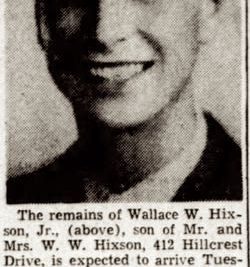 The remains of Wallace W. Hixson, Jr., Son of Mr. and Mrs. W.W. Hixson, 412 Hillcrest Drive, are expected to arrive Tuesday at 10 a.m. from Henri-Chapelle Cemetery in Belgium for reburial here.