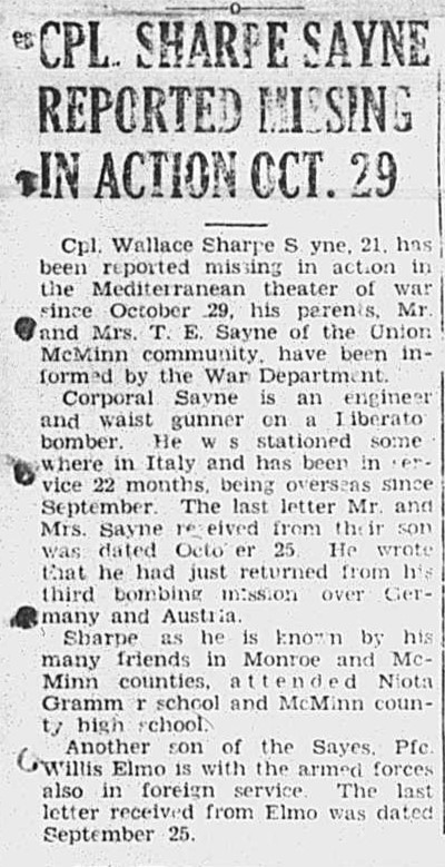 Mr. and Mrs. T.E. Sayne of the Union McMinn community, have received a telegram from the War Department, informing them that their son, Corporal Wallace Sharp Sayne, 21, who was previously reported missing in action over Munich, Germany since October 29, was killed in action on that day. Corporal Sayne, waist gunner and aerial engineer on a B-24 Liberator bomber had been in service two years and had been overseas 43 days when his plane was reported missing.