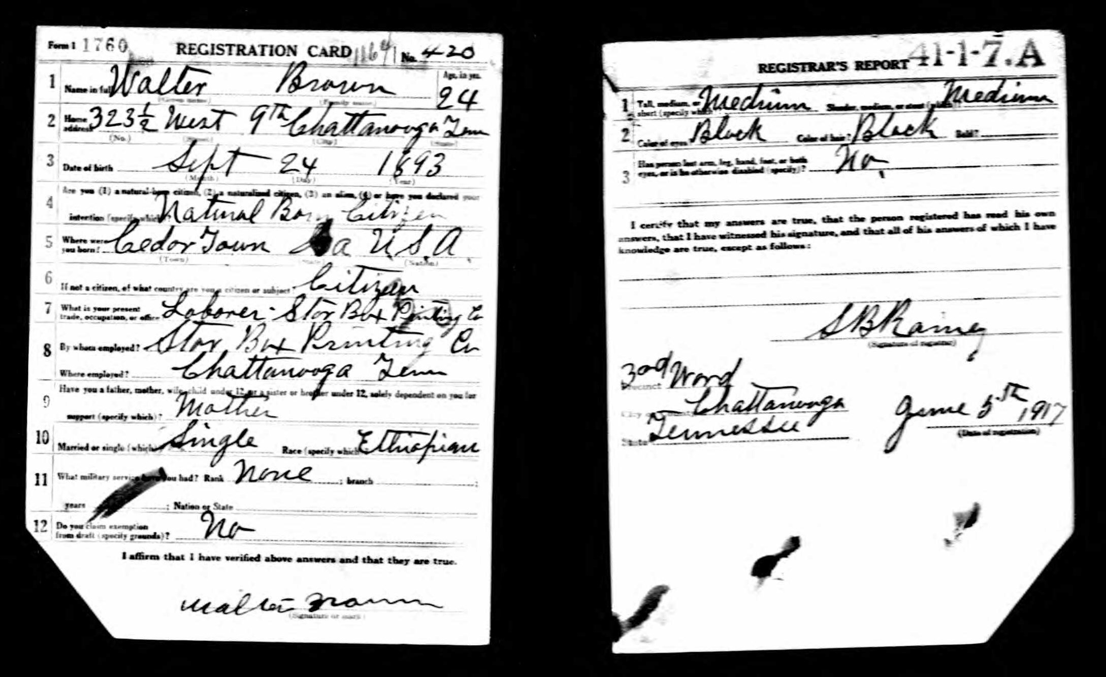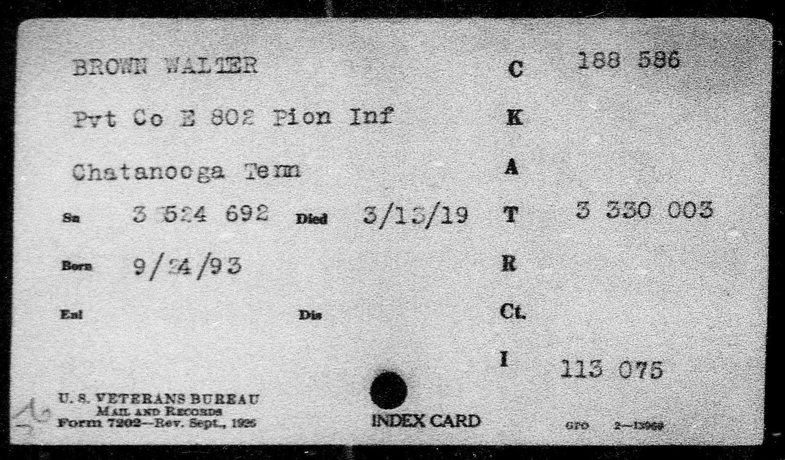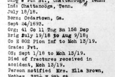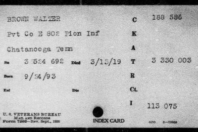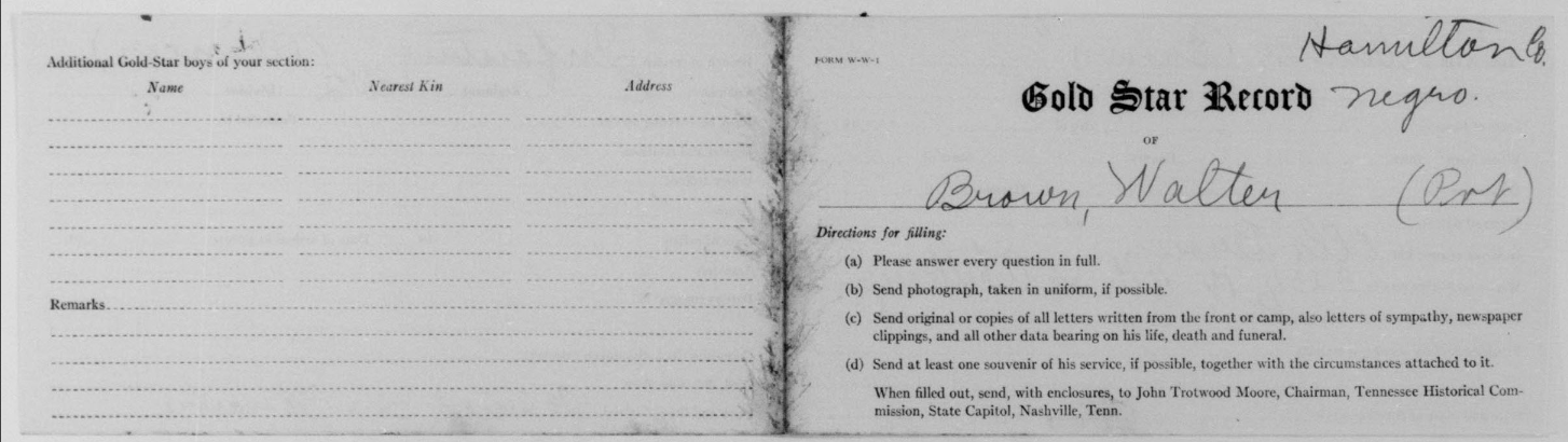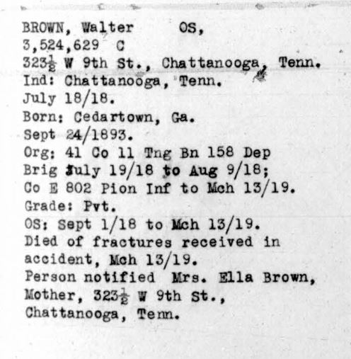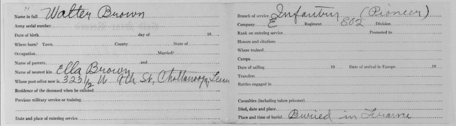 Walter Brown was born in 1893 at Cedartown, Georgia, son of Ella Brown. He died of fractures received in an accident on 13 March 1919 and is buried plot D, row 18, grave 25, at Oise-Aisne American Cemetery, Fère-en-Tardenois, France.