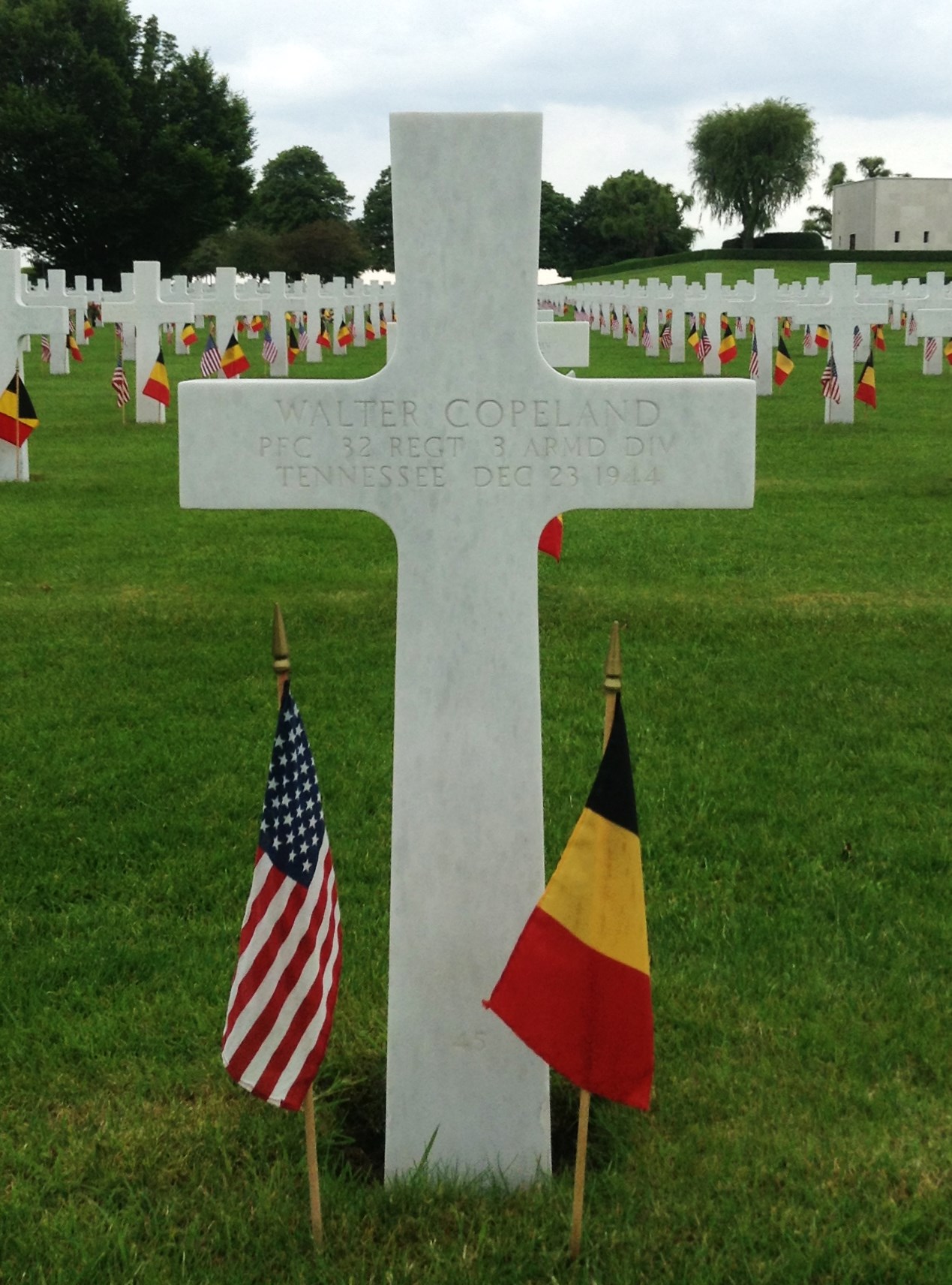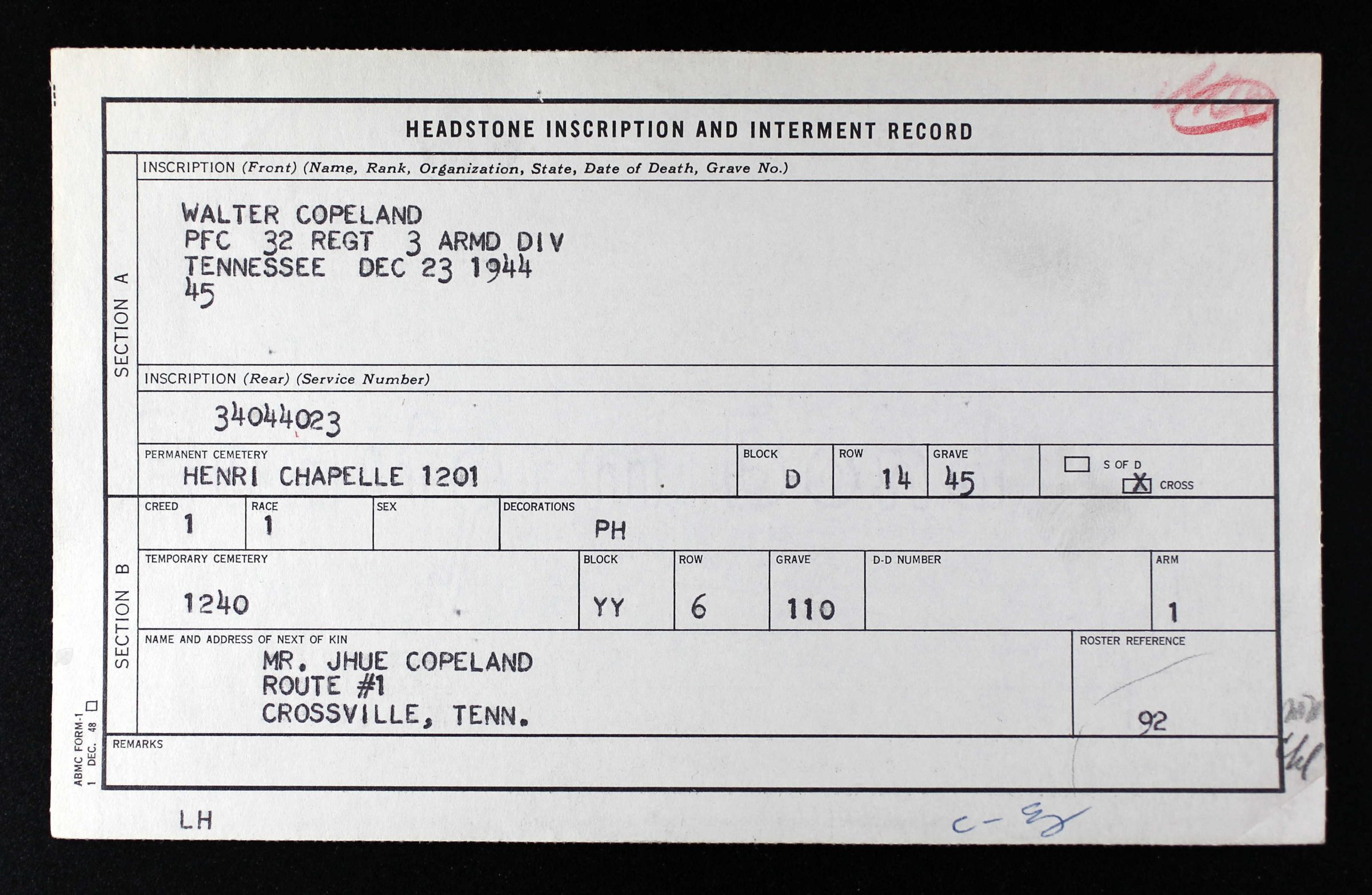PFC Copeland was killed in combat on 23 December 1944. He was interred at Henri-Chapelle American Cemetery, Belgium, plot D, row 14, site 45.