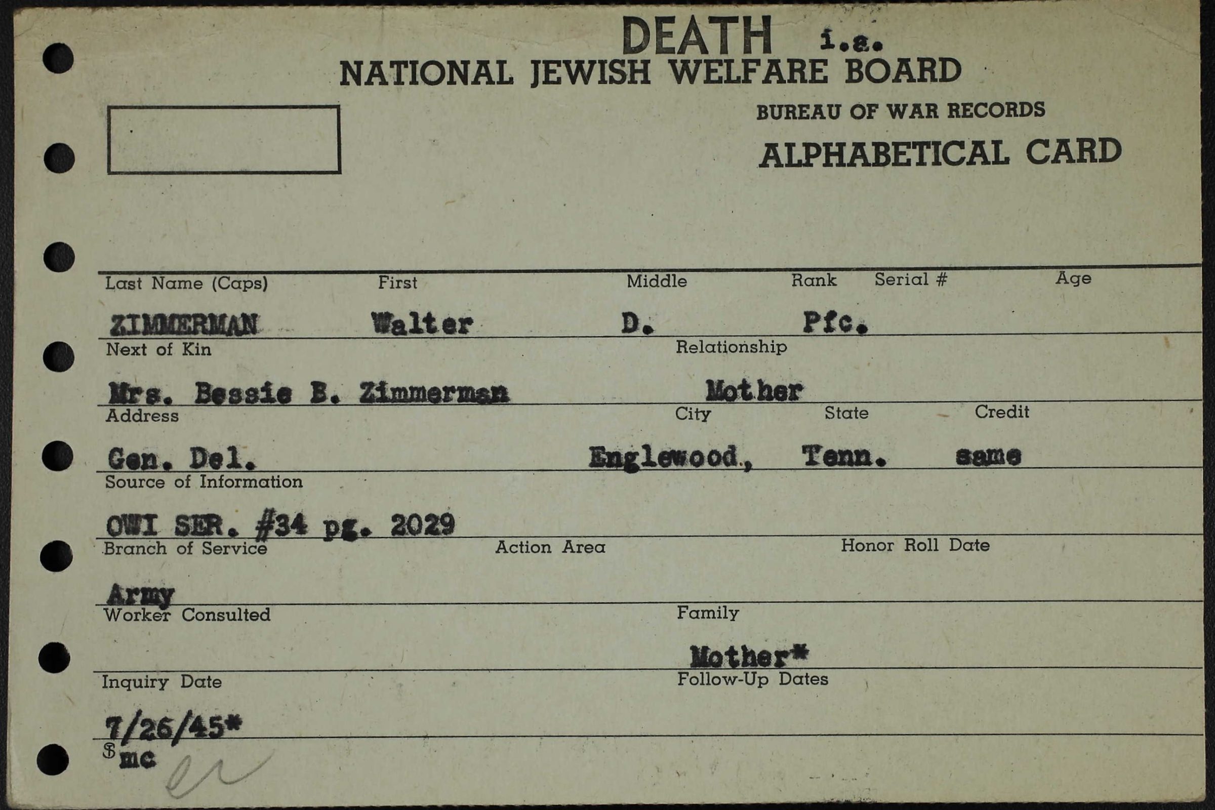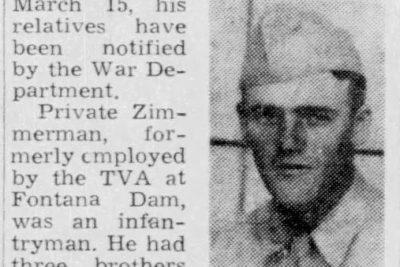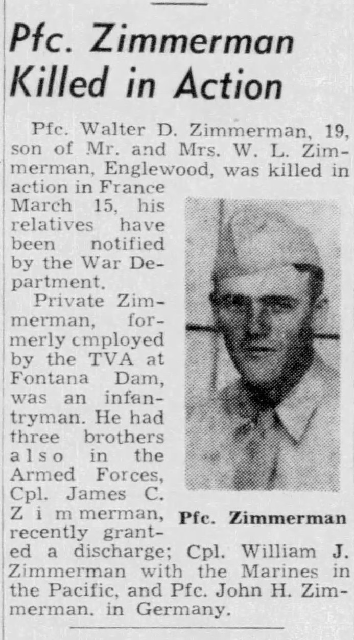 Pfc. Walter D. Zimmerman, 19, son of Mr. and Mrs. W.L. Zimmerman, Englewood, was killed in action in France, March 15, his relatives have been notified by the War Department. Private Zimmerman, formerly employed by the TVA at Fontana Dam, was in infantryman. He had three brothers also in the Armed Forces. Cpl. James C. Zimmerman, recently granted a discharge; Cpl. William J. Zimmerman with the Marines in the Pacific and Pfc. John H. Zimmerman in Germany.