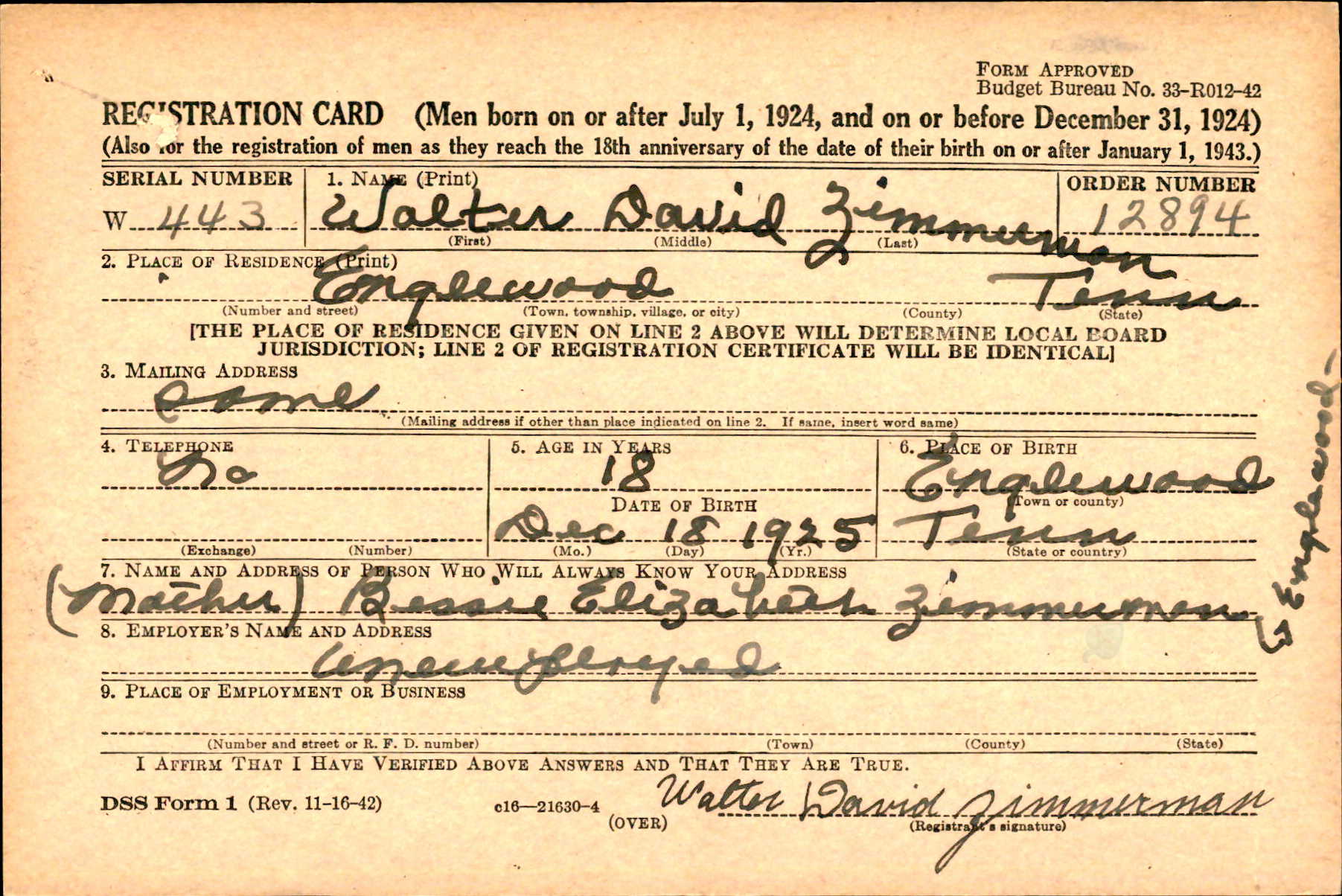 Private First Class Walter David Zimmerman was the son of William Luther Zimmerman and Elizabeth “Bessie” Brock.