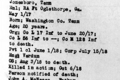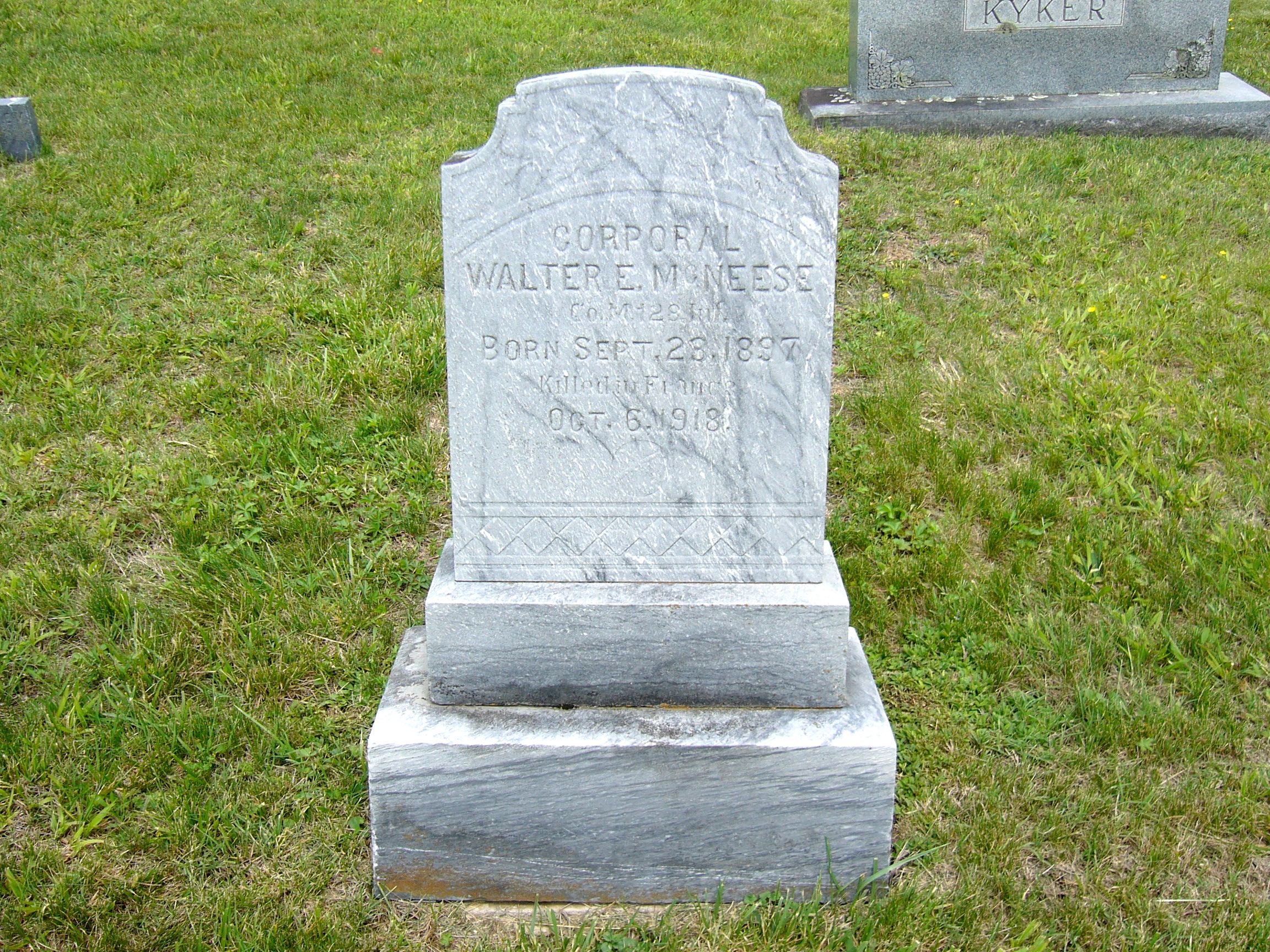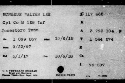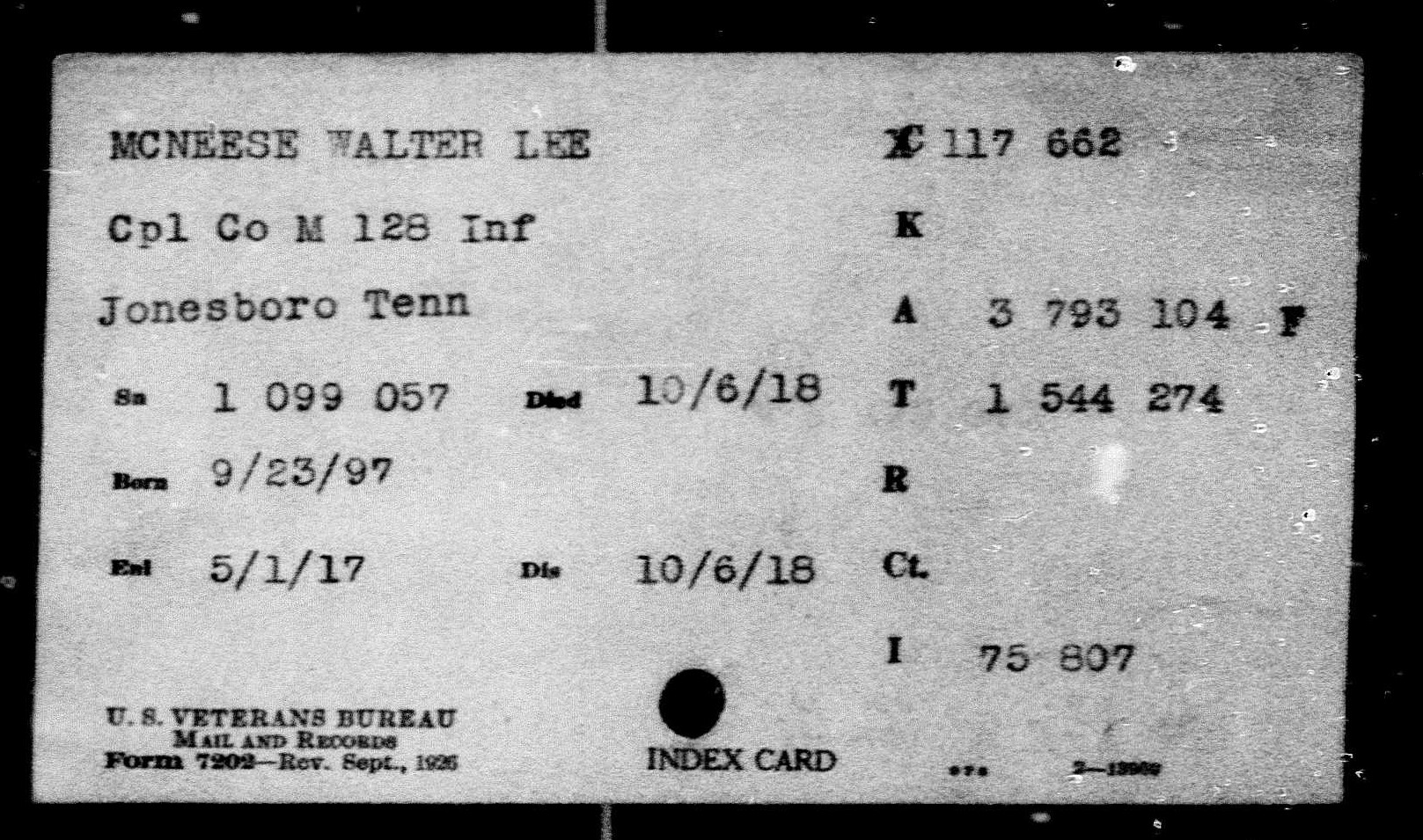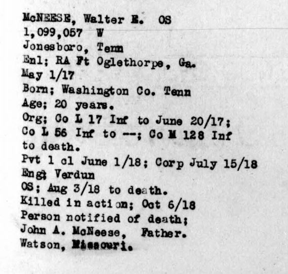 Walter E. McNeese was born in the Lamar Community of Jonesboro, Tennessee. He enlisted in the United States Army at Fort Oglethorpe, Georgia on 1 May 1917.