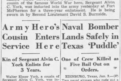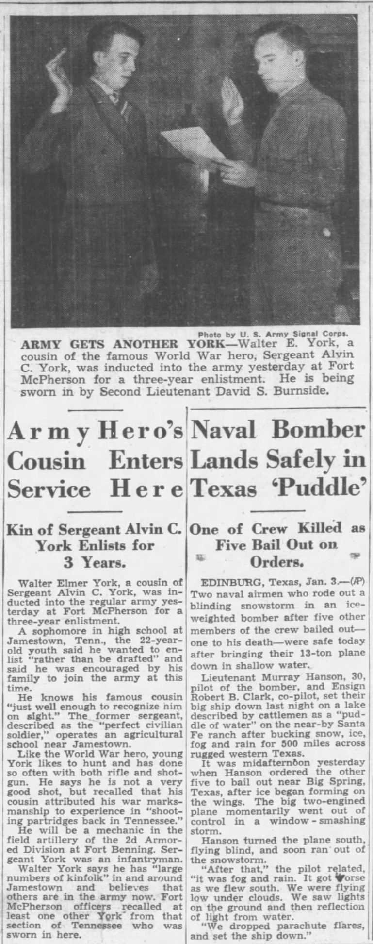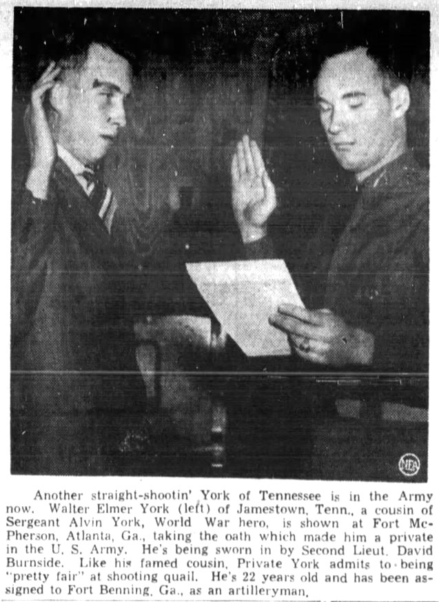 Walter Elmer York, a cousin of Sergeant Alvin C. York, was inducted into the regular army yesterday at Fort McPherson for a three-year enlistment. A sophomore in high school at Jamestown, Tenn., the 22-year-old youth said he wanted to enlist “rather than be drafted” and said he was encouraged by his family to join the army at this time. He knows his famous cousin “just well enough to recognize him on sight.” The former Sergeant, described as the “perfect civilian soldier,” operated an agricultural school near Jamestown. Like the World War hero, young York likes to hunt and has done so often with both rifle and shotgun. He says he is not a very good shot, but recalled that his cousin attributed his marksmanship to experience in “shooting partridges back in Tennessee.” He will be a mechanic in the field artillery of the 2nd Armored Division at Fort Benning. Sergeant York was an infantryman. Walter York says he has “large numbers of kinfolk” in and around Jamestown and believes that others are in the army now. Fort McPherson officers recalled at least one other York from that section of Tennessee who was sworn in here.