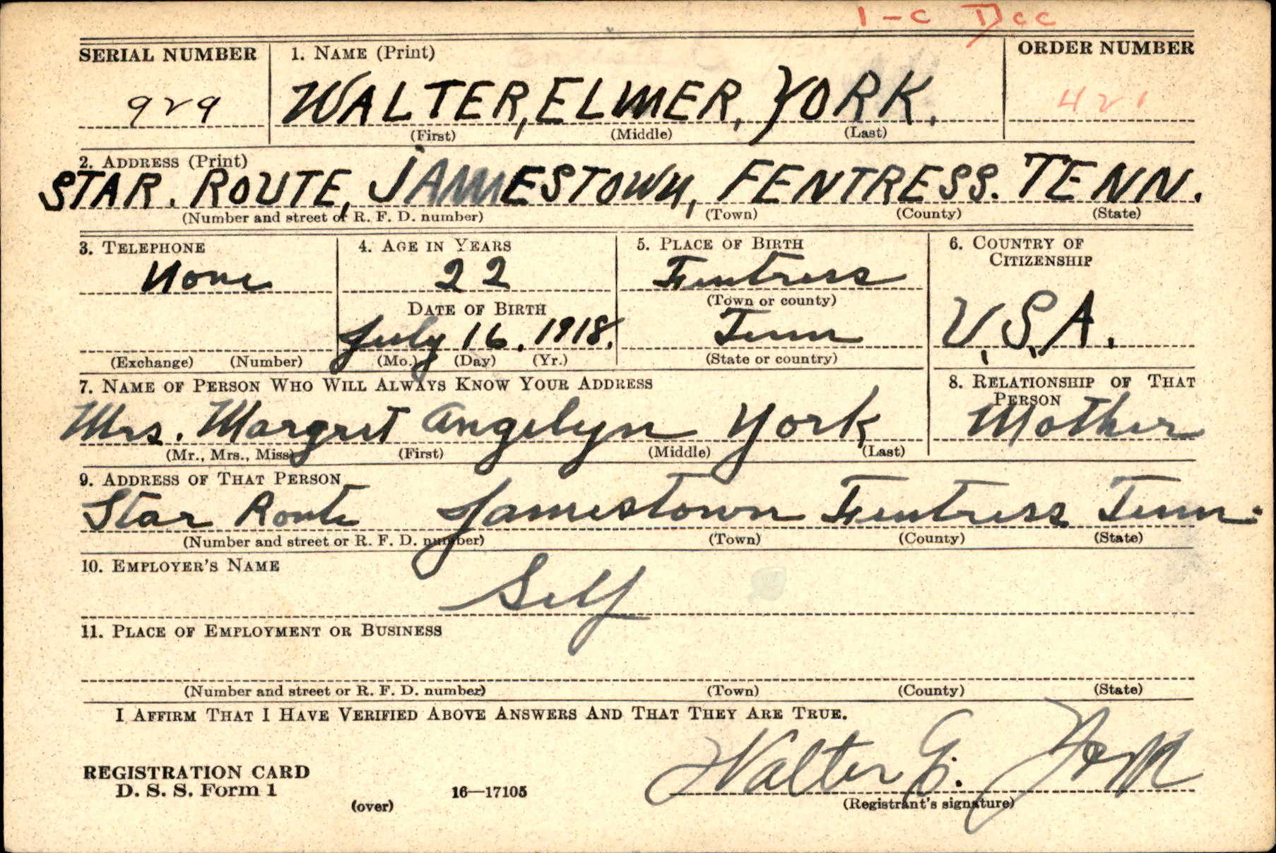 Walter Elmer York was born on 16 July 1918, Fentress County, Tennessee, the son of Jessie Francis York and Margaret “Maggie” Angline Crisp. Second Cousing of World War I hero Alvin Calvin York.