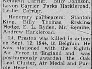 Lt. Preston was killed in action on Sept. 12, 1944 in Belgium. He was stationed with the Eight Air Force in England and was posthumously awarded the Oak Leaf Cluster, Air Medal and Purple Heart.