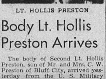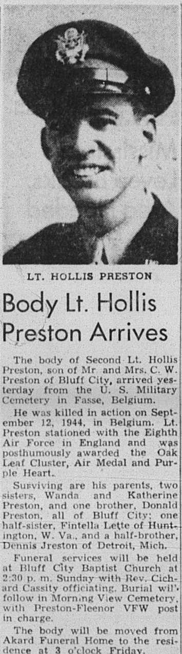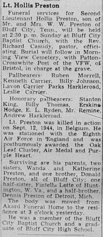 Funeral services for Second Lieutenant Hollis Preston, son of Mr. and Mrs. W.W. Preston of Bluff City, Tenn. Will be held at 2:30 p.m. Sunday at Bluff City Baptist Church. Burial will follow in Morning View Cemetery.