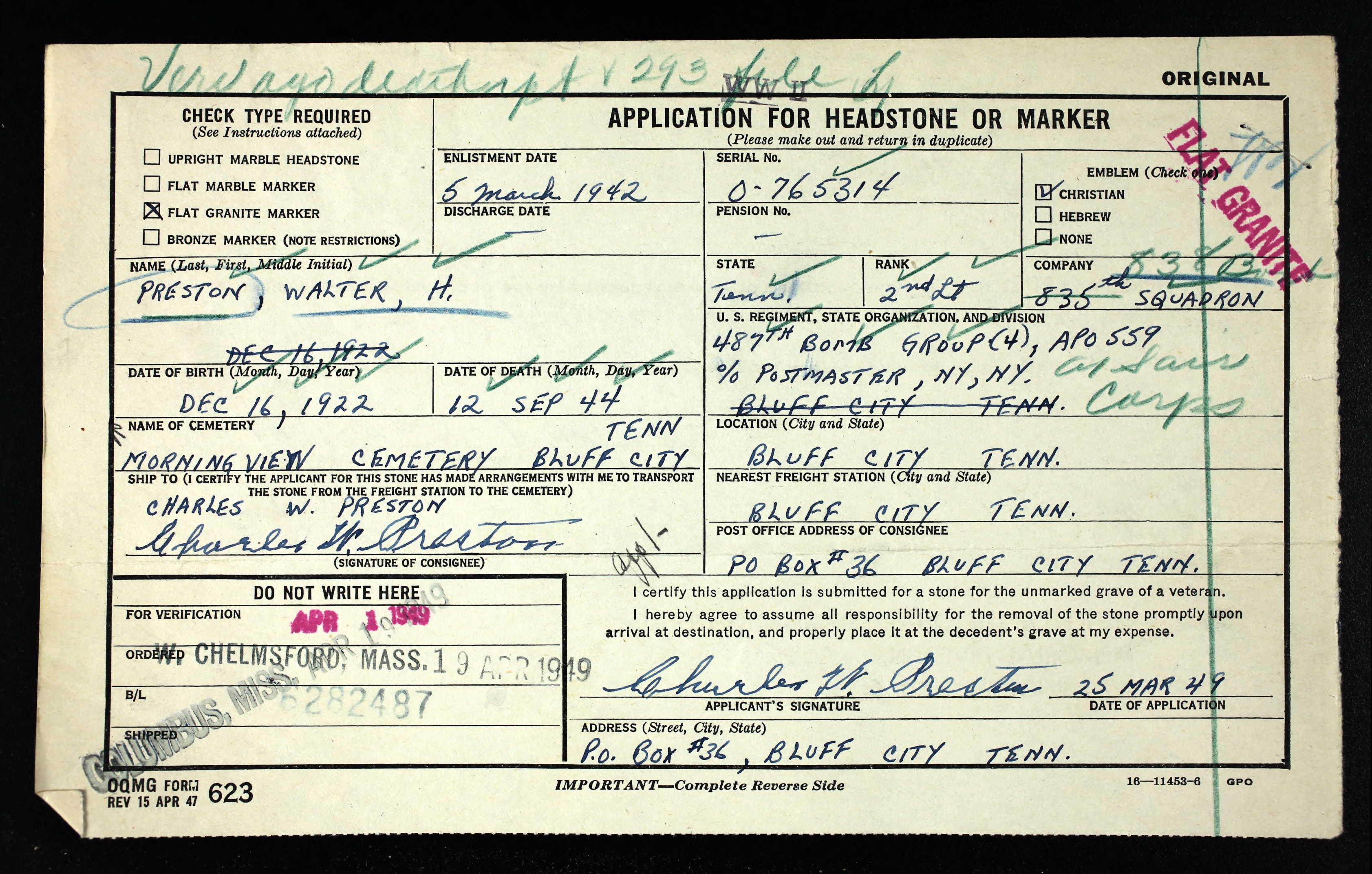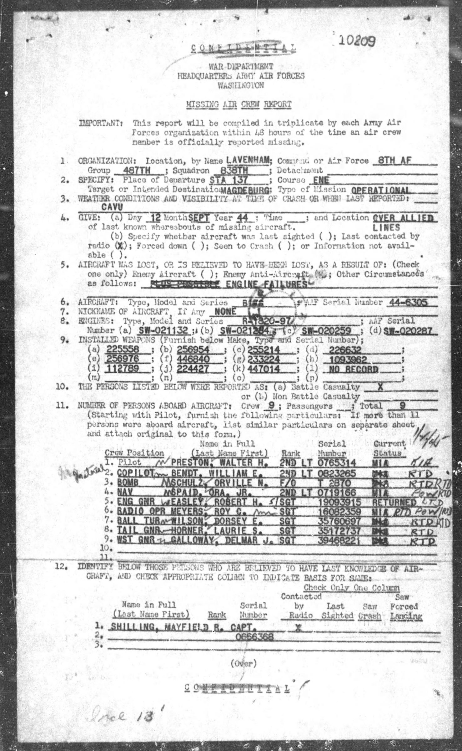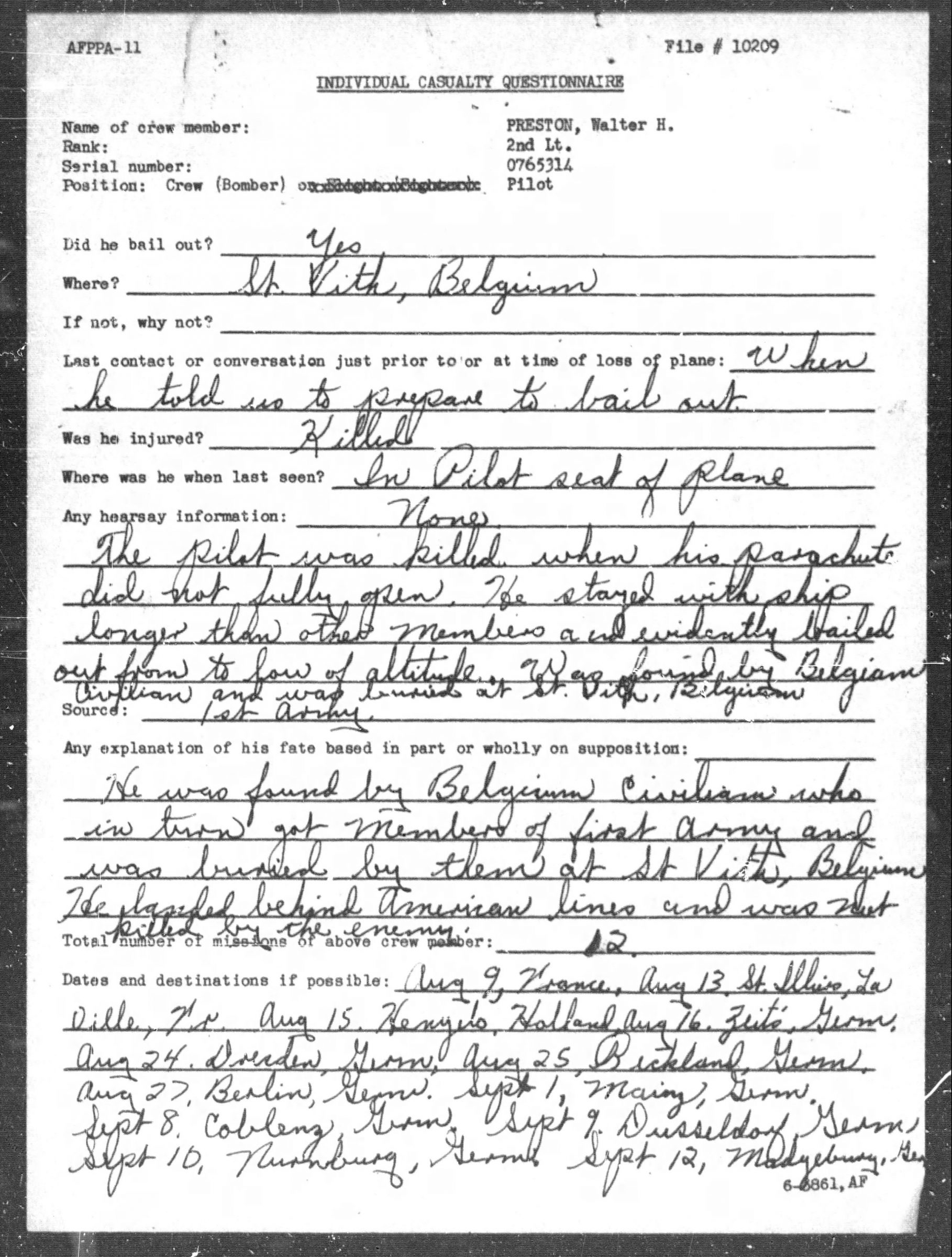 2nd Lt Preston bailed out near St. Vith, Belgium. He was killed when his parachute did not fully open. He stayed with the ship longer than the other members and evidently bailed out from too low an altitude. He landed behind American lines and was found by Belgium civilians and was initially buried at St. Vith, Belgium.
