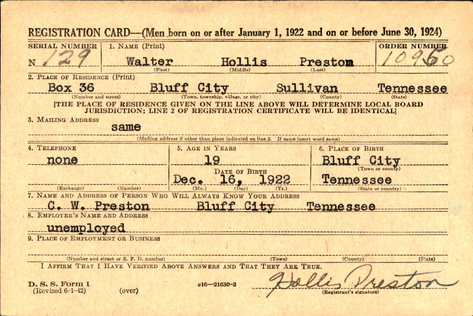 Walter Hollis Preston was born 16 December 1922, the son of Charles Walter Preston and Katherine “kate” Combs.