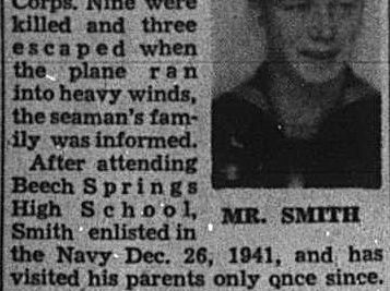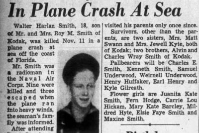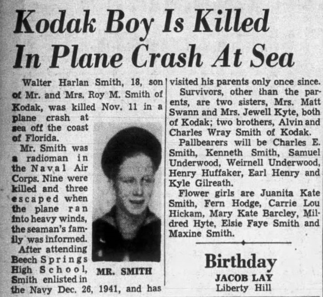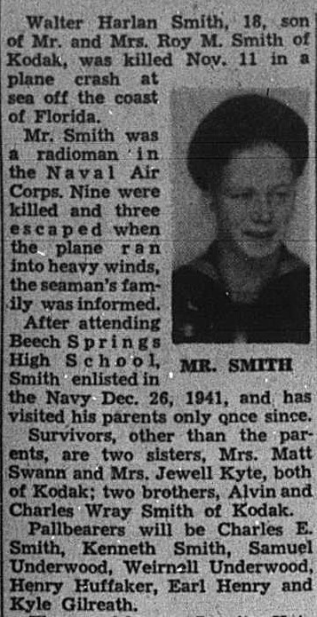 Walter Harlan Smith, 18, son of Mr. and Mrs. Roy M. Smith, of Kodak, was killed Nov. 11 in a plane crash at sea off the coast of Florida. Mr. Smith was a radioman in the Naval Air Corps. Nine were killed and three escaped when the plane ran into heavy winds, the seaman’s family was informed. After attending Beech Springs High School, Smith enlisted in the Navy Dec. 26, 1941, and has visited his parents only once since. Survivors, other than the parents, are two sisters, Mrs. Matt Swann and Mrs. Jewell Kyte, both of Kodak; two brothers, Alvin and Charles wray Smith of Kodak.