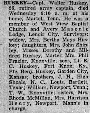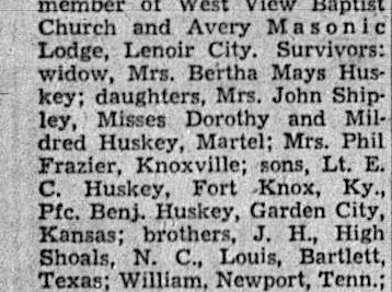 Survivors: widow, Mrs. Bertha Mays Huskey; daughters, Mrs. John Shipley, Misses Dorothy and Mildred Huskey, Martel; Mrs. Phil Frazier, Knoxville; sons, Lt. E.C. Huseky, Fort Knox, Ky., Pfc. Benj. Huskey, Garden City, Kansas; brothers J.H. High Shoals, N.C., Louis, Bartlett, Texas; William Newport, Tenn.; T.W., Knoxville; sisters, Mrs. Rhoda McMillan, Mrs. Harrison Henry, Newport.