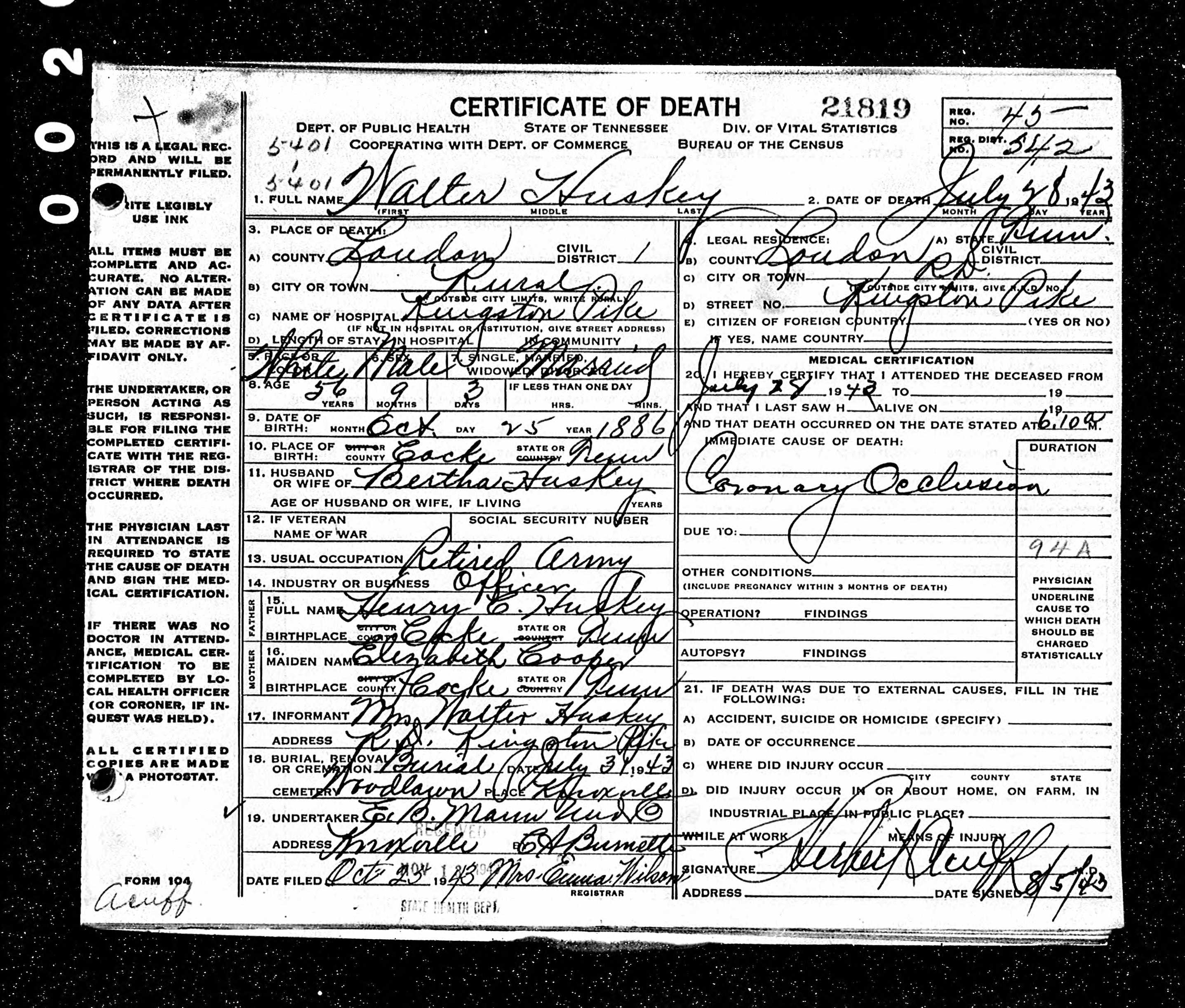 Captain Huskey was a retired Army Officer. He died on 28 July 1943 at a hospital on Kingston Pike, Loudon County, Tennessee of Coronary occlusion. He served overseas during World War I with the 117th Infantry, 3rd Battalion, Supply Company.