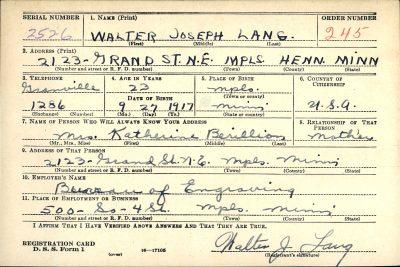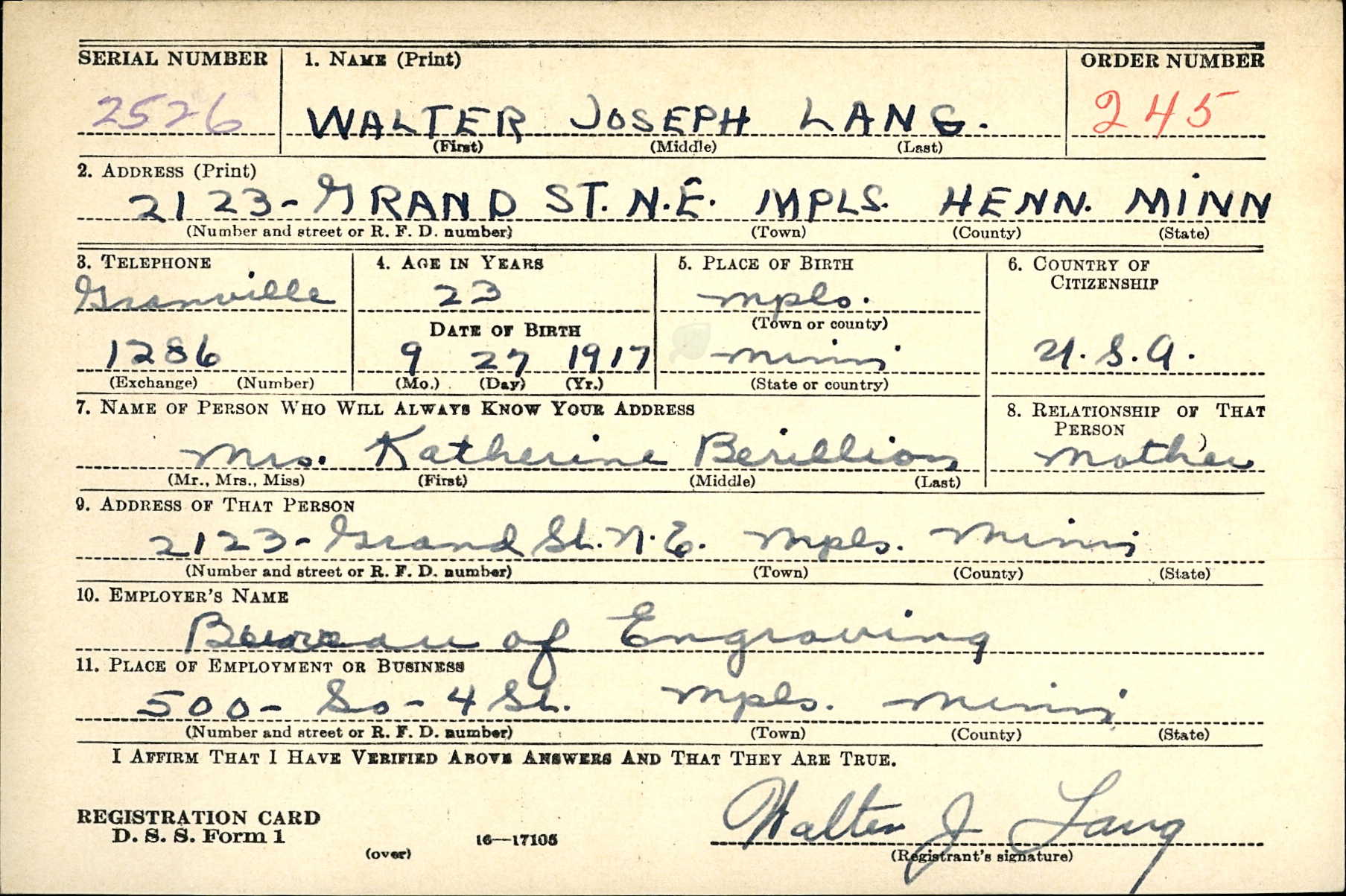 Walter Joseph Lang was born at Minneapolis, Minnesota, the son of E. Russell Lang and Katherine Kleifgen. Stepson of Egon Lothar Berillon. Husband of Adeline Sophia Tessman.