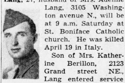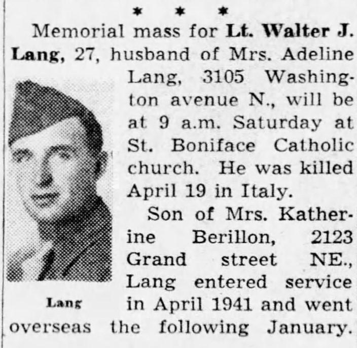 Memorial mass for Lt. Walter J. Lang, 27, husband of Mrs. Adeline Lang, 3105 Washington avenue N., will be at 9 a.m. at St. Boniface Catholic church. He was killed April 19 in Italy. Son of Mrs. Katherine Berillon, 2123 Grand street NE., Lang entered service in April 1941 and went overseas the following January.