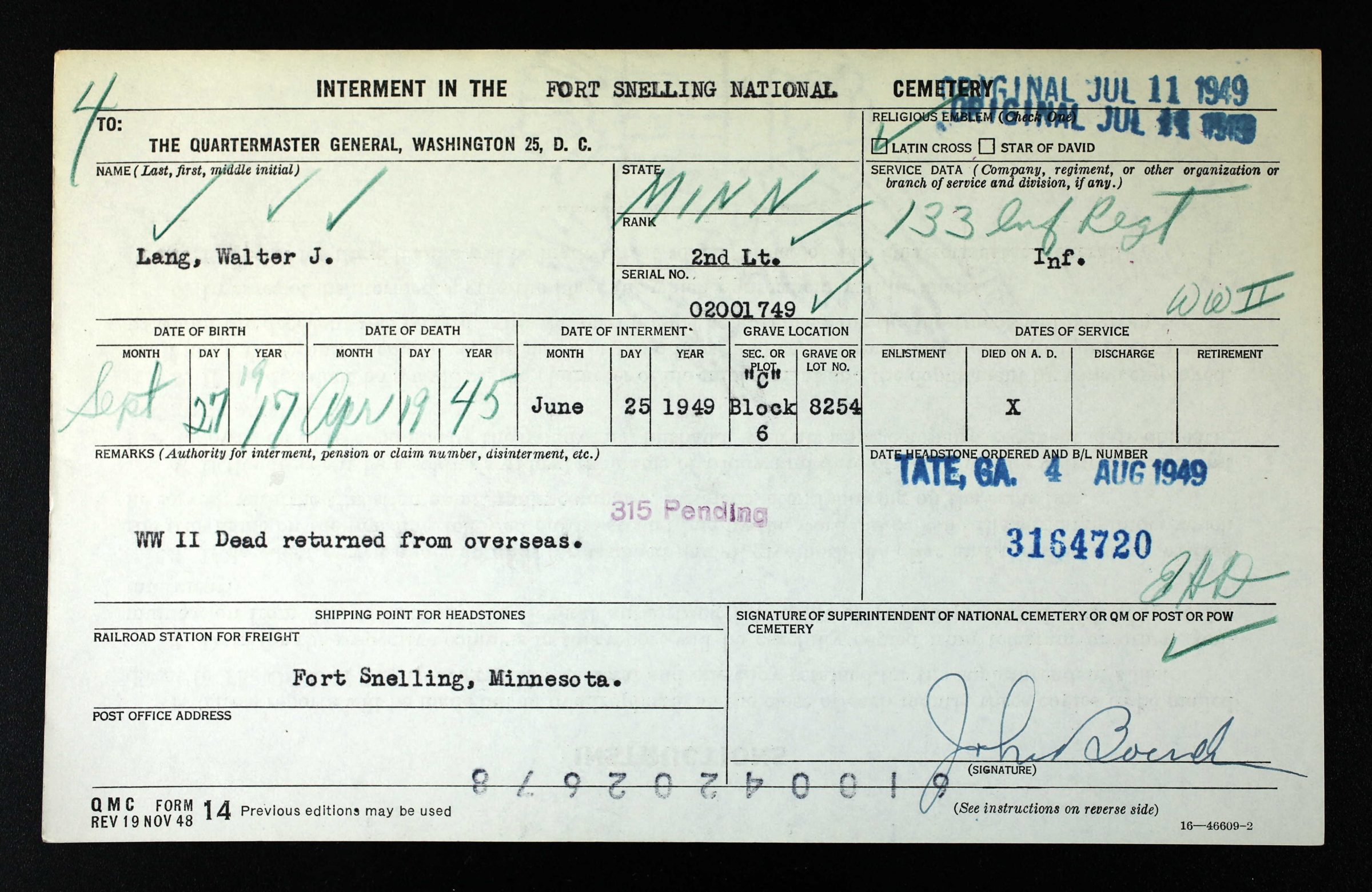 - Burial/Memorial Location: Fort Snelling National Cemetery, Minneapolis, Hennepin County, Minnesota