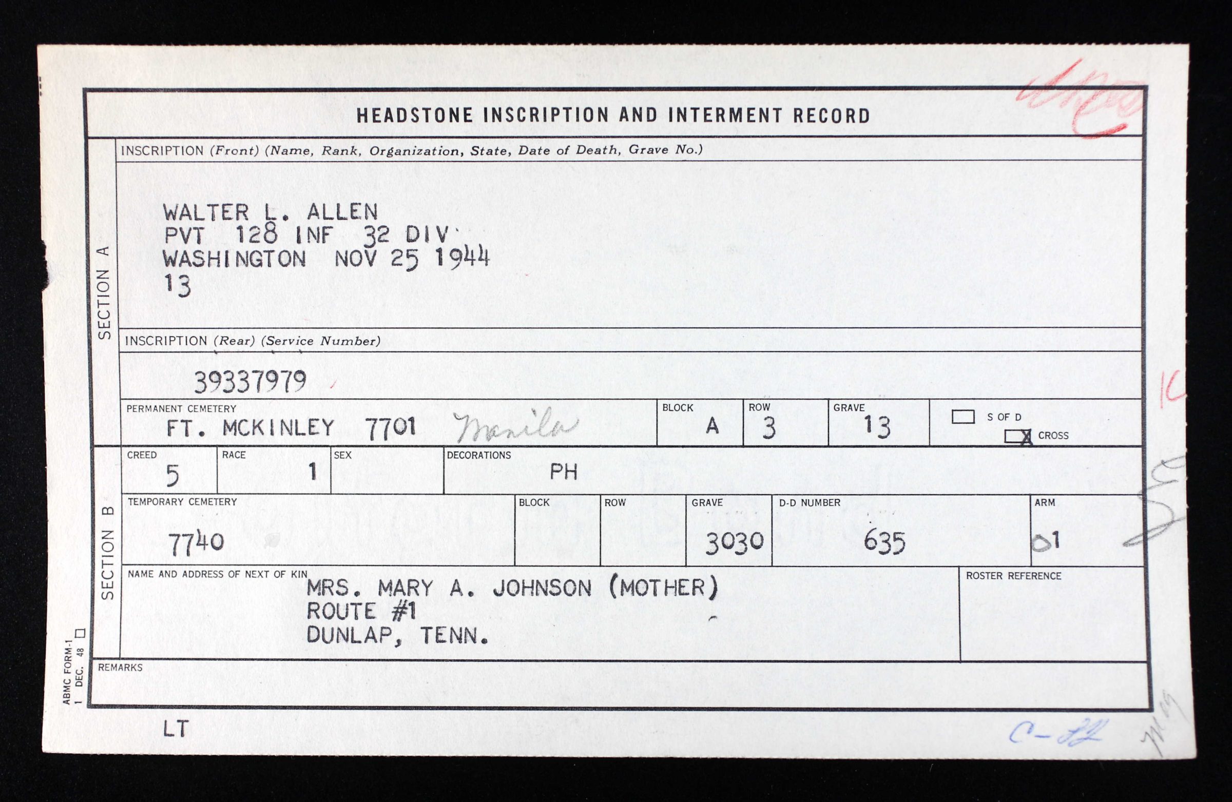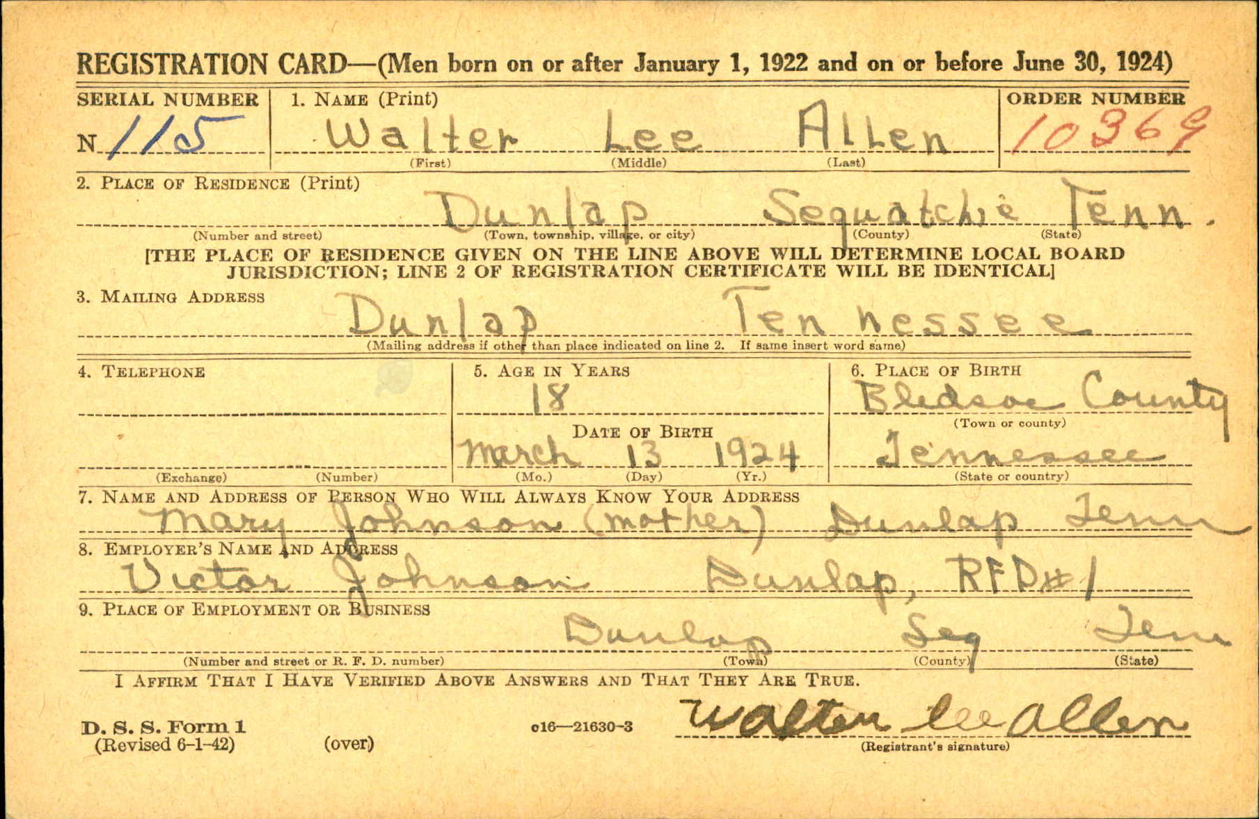 Walter Lee Allen was the son of Howard Allen and Mary Skyles. Howard Allen and Mary Skyles were married on 18 December 1907 in Sequatchie. Mary Skyles later married Herbert Johnson. Pvt. Allen was survived by his parents, Mr. and Mrs. Herbert Johnson; three brothers, Jimmie and Clifford of Dunlap, Herbert Allen of Chattanooga; three sisters, Mrs. Minnie Cooley of Pikeville, Mrs. Juanita Boston of Falling Water, Mrs. John Hickenbotton, Dunlap. His brother Corporal Walter W. Allen died in Korea on 20 July 1950.