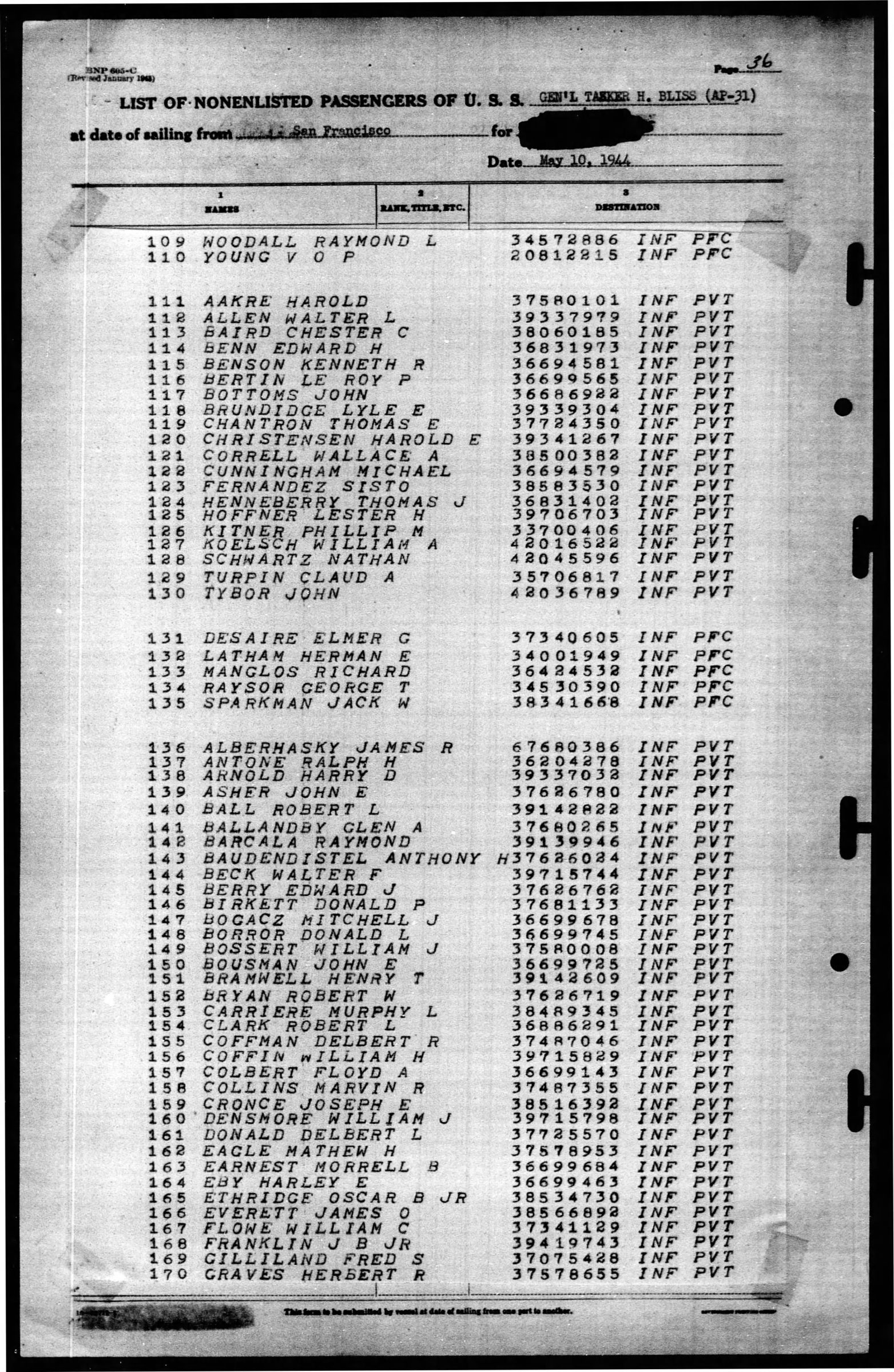 Walter L. Allen entered the service from Washington. He was born around 1924 in Tennessee, and he resided at King County, Washington, and enlisted in Oregon. He was a passenger on the U.S.S. General T. H. Biss (AP-31) on 20 May 1944, sailing from San Francisco. The USS General T. H. Bliss (AP-131) was a General G. O. Squier-class transport ship for the U.S. Navy in World War II. She was named in honor of U.S. Army general Tasker Howard Bliss. Decommissioned in 1946, she was sold privately in 1964 and renamed SS Seamar, and was scrapped in 1979.[1]