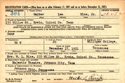 Walter Lee Rice Jr. was born 17 December 1921 in Milligan College, Tennessee. He was the son of Walter Lee Rice Sr. and Bertha Mae Ellis. His brother Robert Edward Rice served during WWII with the USNR on the USS Houston