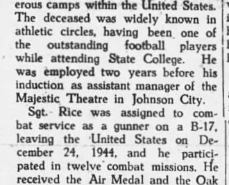 Sgt. Rice was a graduate of Unicoi County High School. After his graduation, he attended the University of Tennessee for one year and East Tennessee State College for two years. He enlisted in the service at the end of his second year at State and was inducted into the service in April, 1943. He was trained at numerous camps within the United States. The deceased was widely known in athletic circles, having been one of the outstanding football players while attending State College. He was employed two years before his induction as assistant manager of the Majestic Theatre in Johnson City. Sgt. Rice was assigned to combat service as a gunner on a B-17, leaving het United States on December 24, 1944, and he participated in twelve combat missions. He received the Air Medal and the Oak Leaf Cluster while in the service. Sgt. Rice was killed in action over Boohlen, Germany, on March 2, 1945. Survivors are his parents, Mr. and Mrs. W.L. Rice; two brothers, Z.E. Rice, Kingsport, Tennessee and Robert Rice of Erwin; two sisters, Mrs. Ralph Striker, St. Louis, Mo., and Patricia Rice, of Erwin. Interment will be in Evergreen Cemetery.