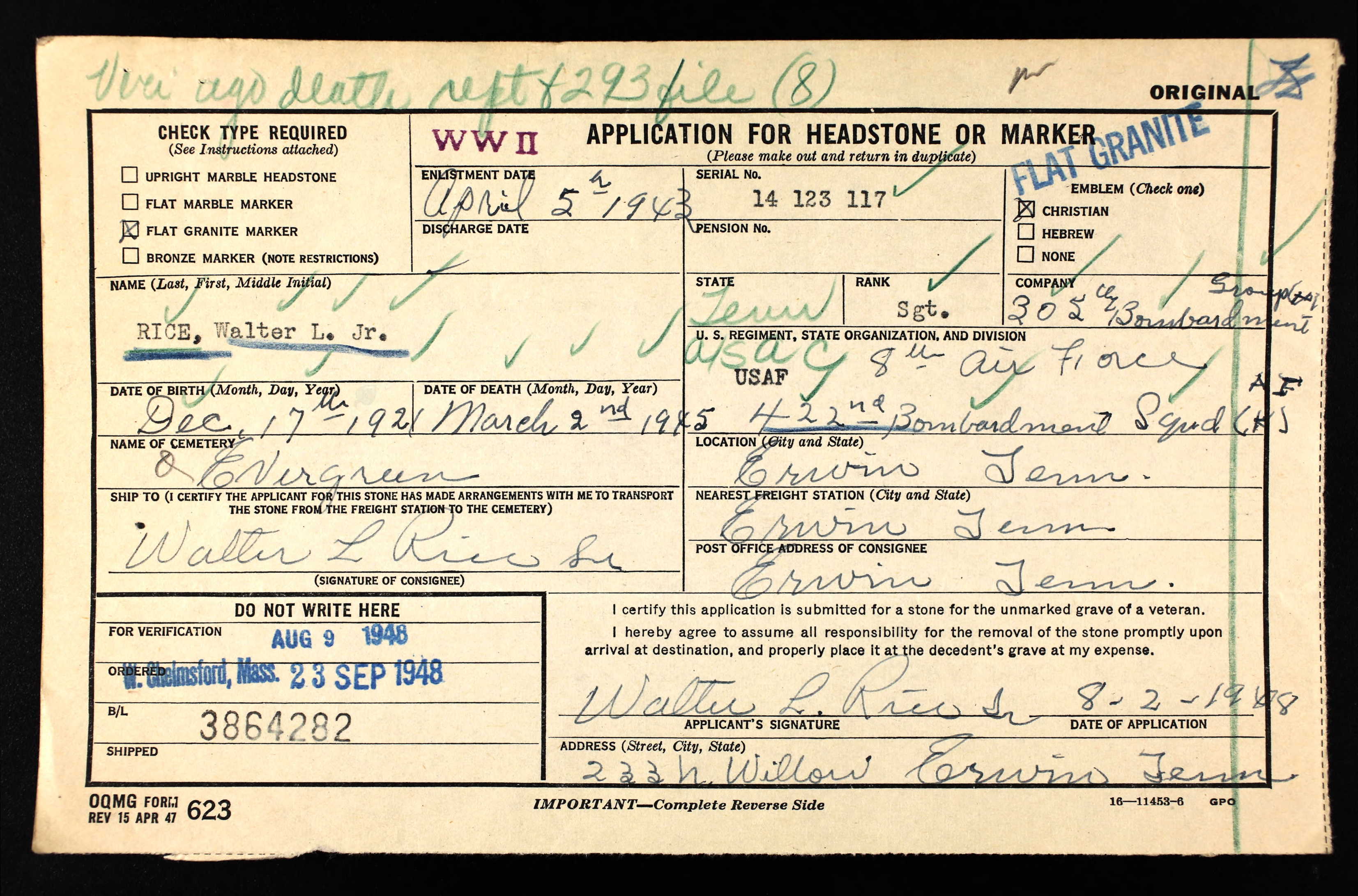 Sgt Rice was buried on 3 March 1945 in the American Military Cemetery, Cambridge, England. He was subsequently buried at Evergreen Cemetery, Erwin, TN.