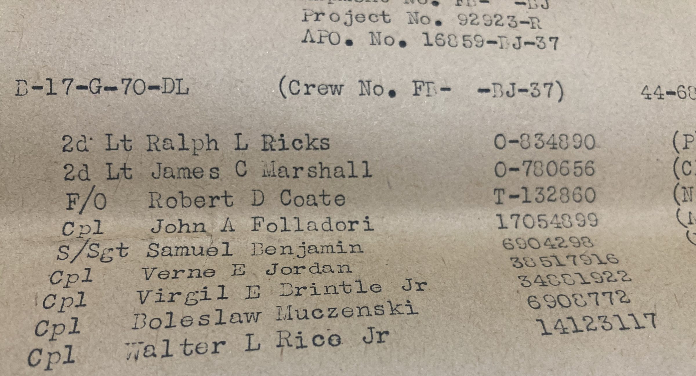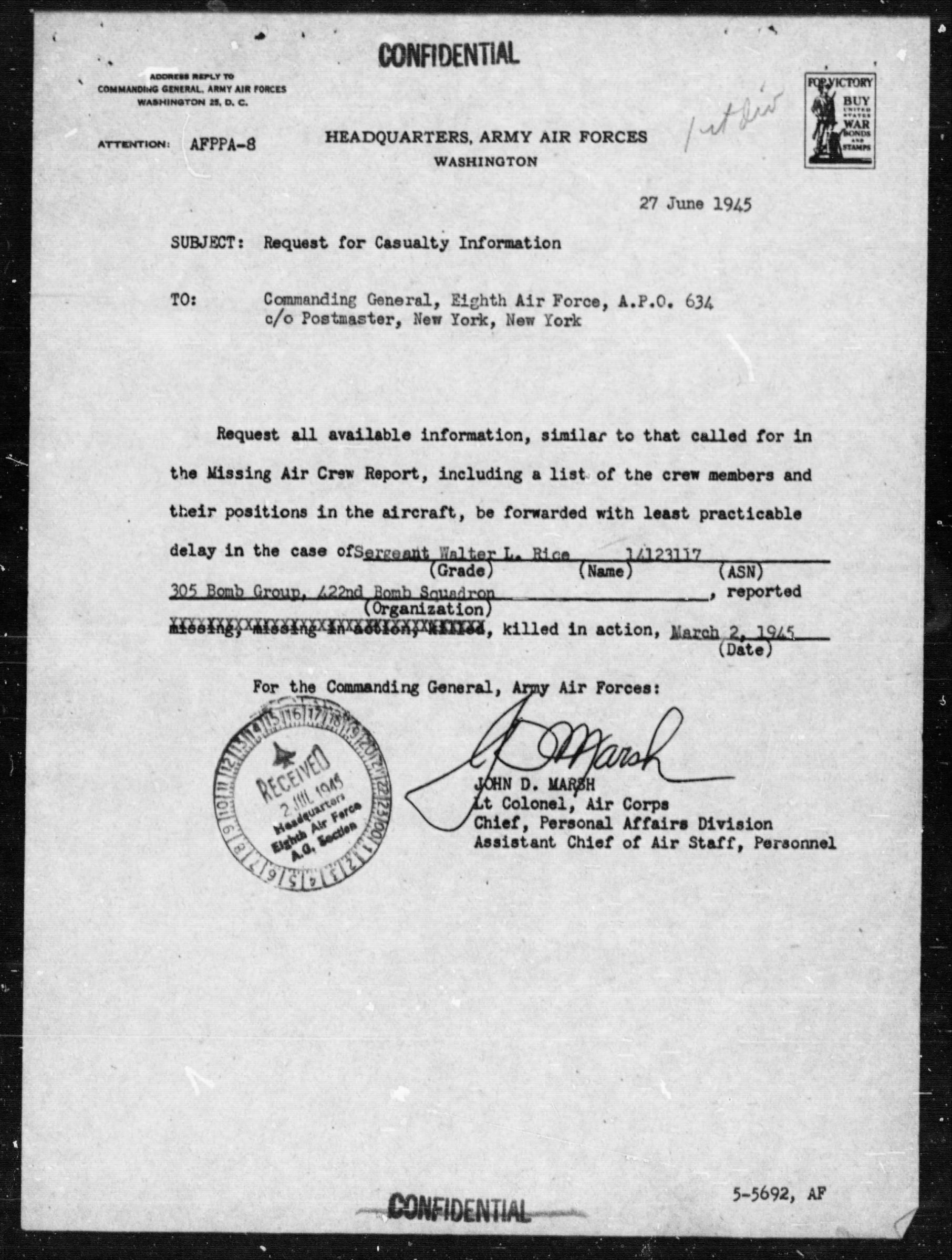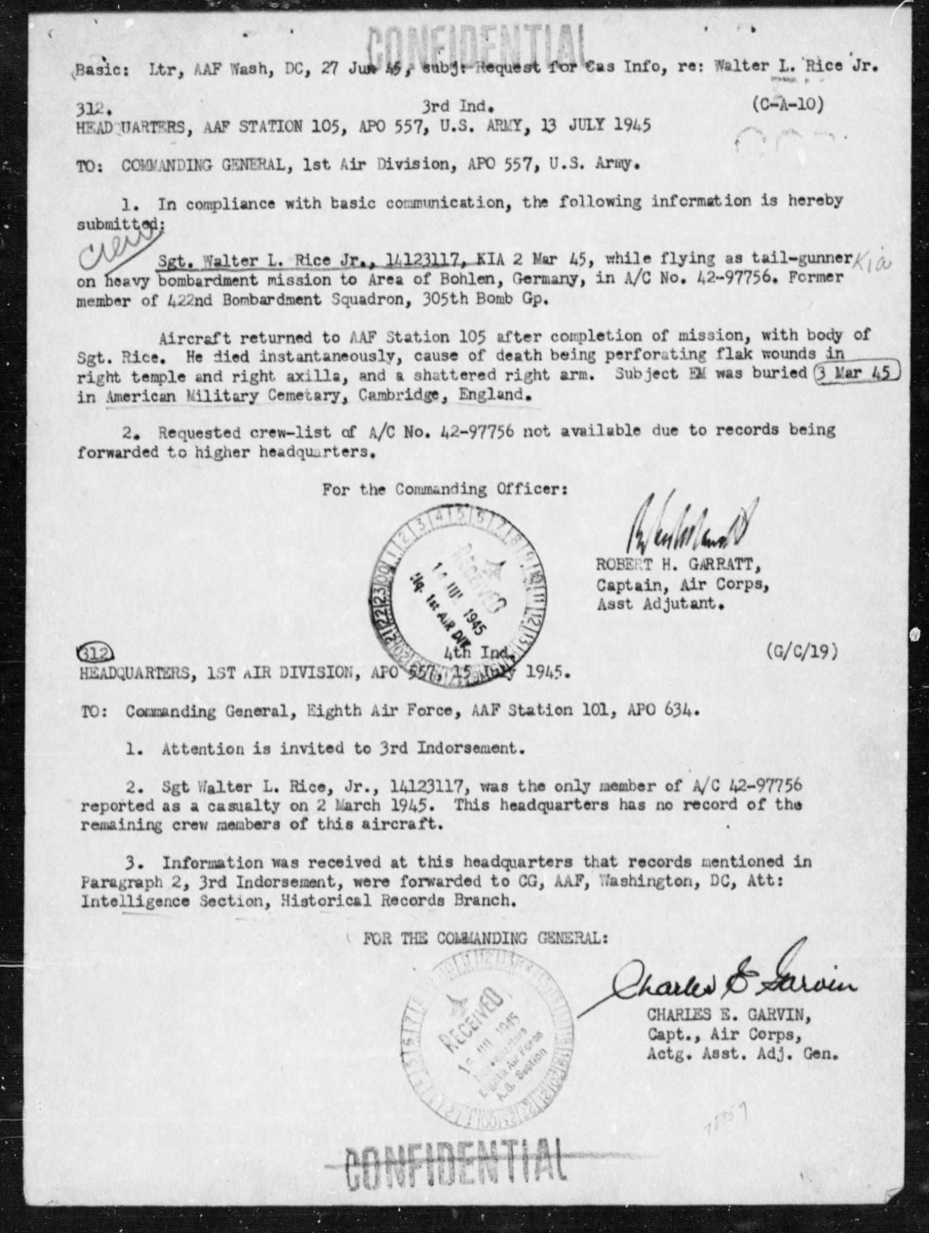 The aircraft B-17G with serial number 42-97756 was on a heavy bombardment mission to the area of Bohlen in Germany. Sgt Rice was the Tail Gunner. The aircraft returned to AAF Station 105 after completion of the mission, with the body of Sgt. Rice. He died instantaneously, cause of death being perforating flak wounds in the right temple and right axilla, and a shattered right arm.