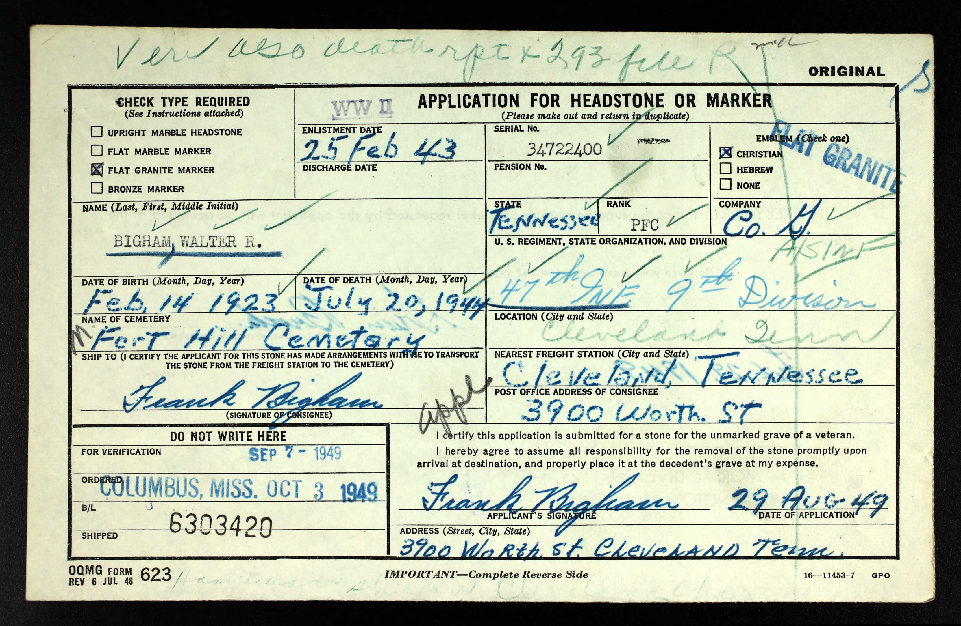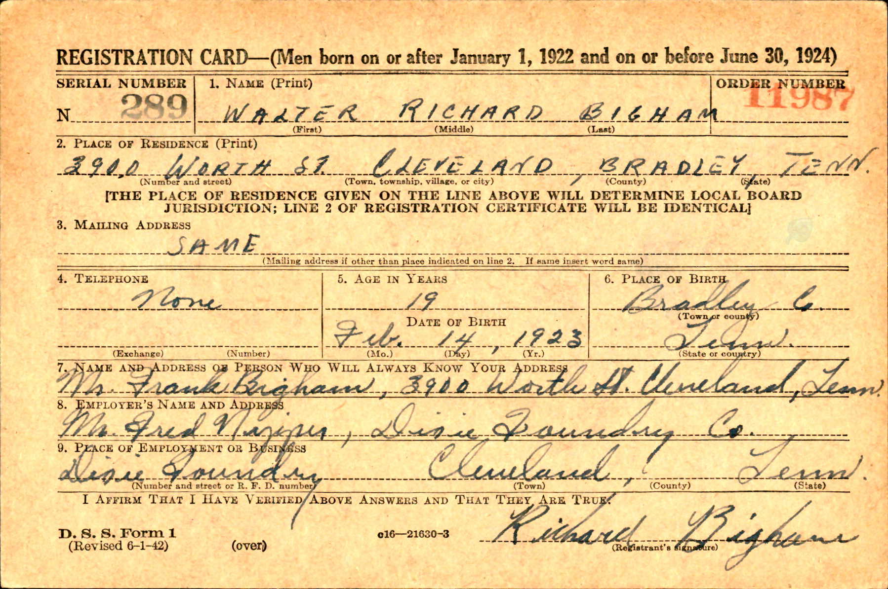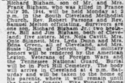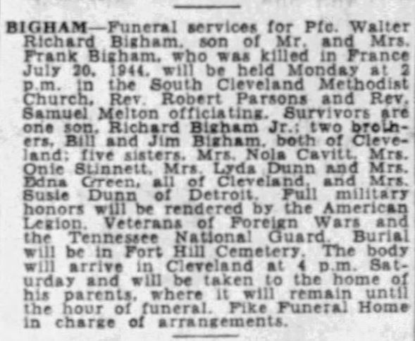 Funeral services for Pfc. Walter Richard Bigham, son of Mr. and Mrs. Frank Bigham, who was killed in France July 20, 1944, will be held in the South Cleveland Methodist Church. Survivors are one son, Richard Bigham Jr.; two brothers, Bill and Jim Bigham, both of Cleveland; five sisters, Mrs. Nola Cavitt, Mrs. Onie Stinnett, Mrs. Lyda Dunn and Mrs. Edna Green, all of Cleveland and Mrs. Susie Dunn of Detroit. Full military honors will be rendered by the American Legion.