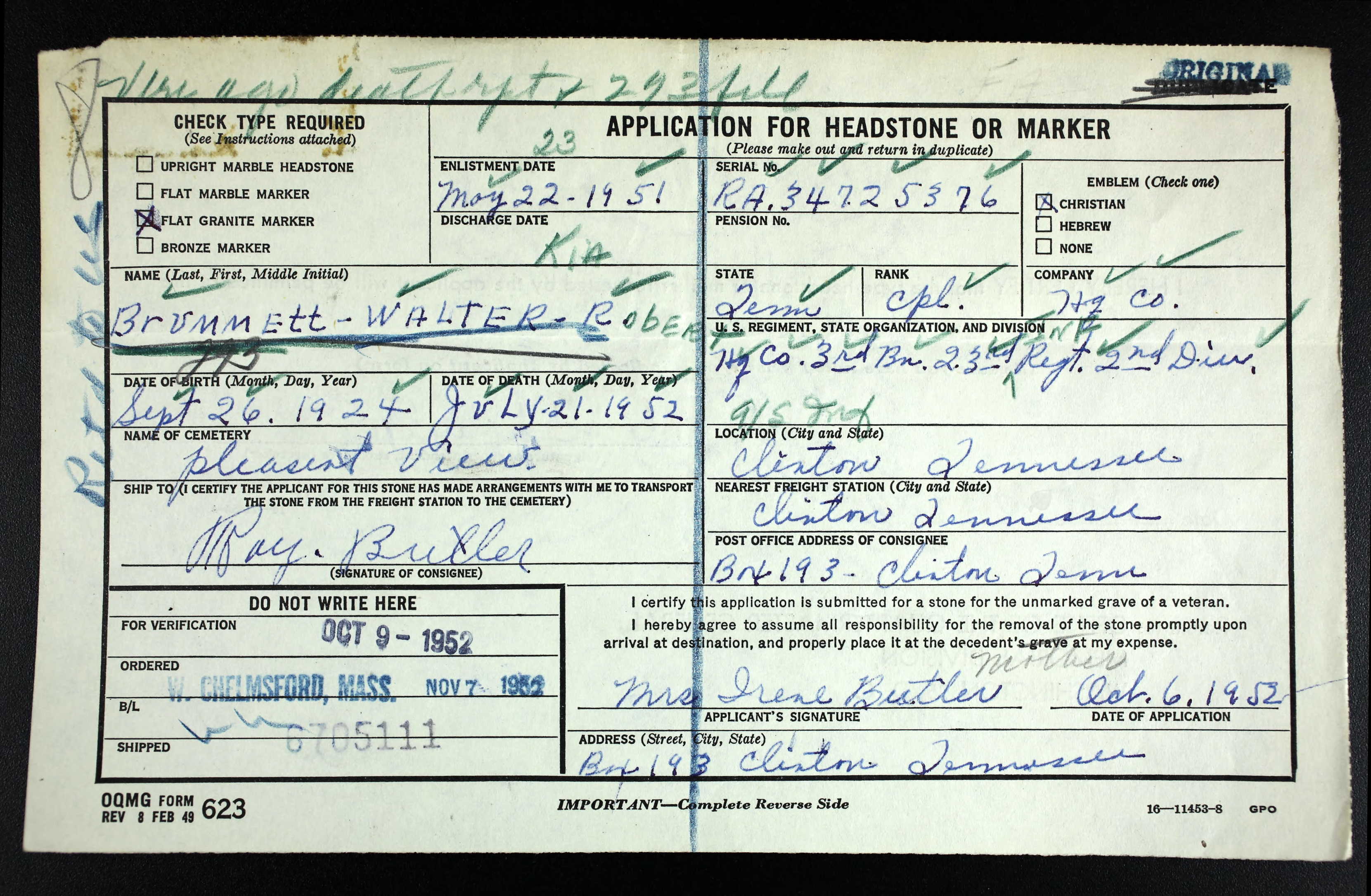 Corporal Walter Robert Brummett was born on September 26, 1924, in Anderson County, Tennessee. He was the son of Floyd H. Brummett and Irene L. Cole Brummett. He enlisted for service in World War II on March 9, 1943, in Fort Oglethorpe, Georgia. After the war, he returned to Anderson County where he married Elizabeth Williams on April 3, 1947. The couple had a child, Walter R. Brummett, Jr., around 1948, before divorcing on January 27, 1950. He then served in Korea in the 23rd Infantry Regiment, 2nd Infantry Division. He was killed in action at Old Baldy, North Korea, on July 21, 1952. He is buried at the Pleasant View Cemetery in Clinton, Tennessee.
