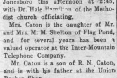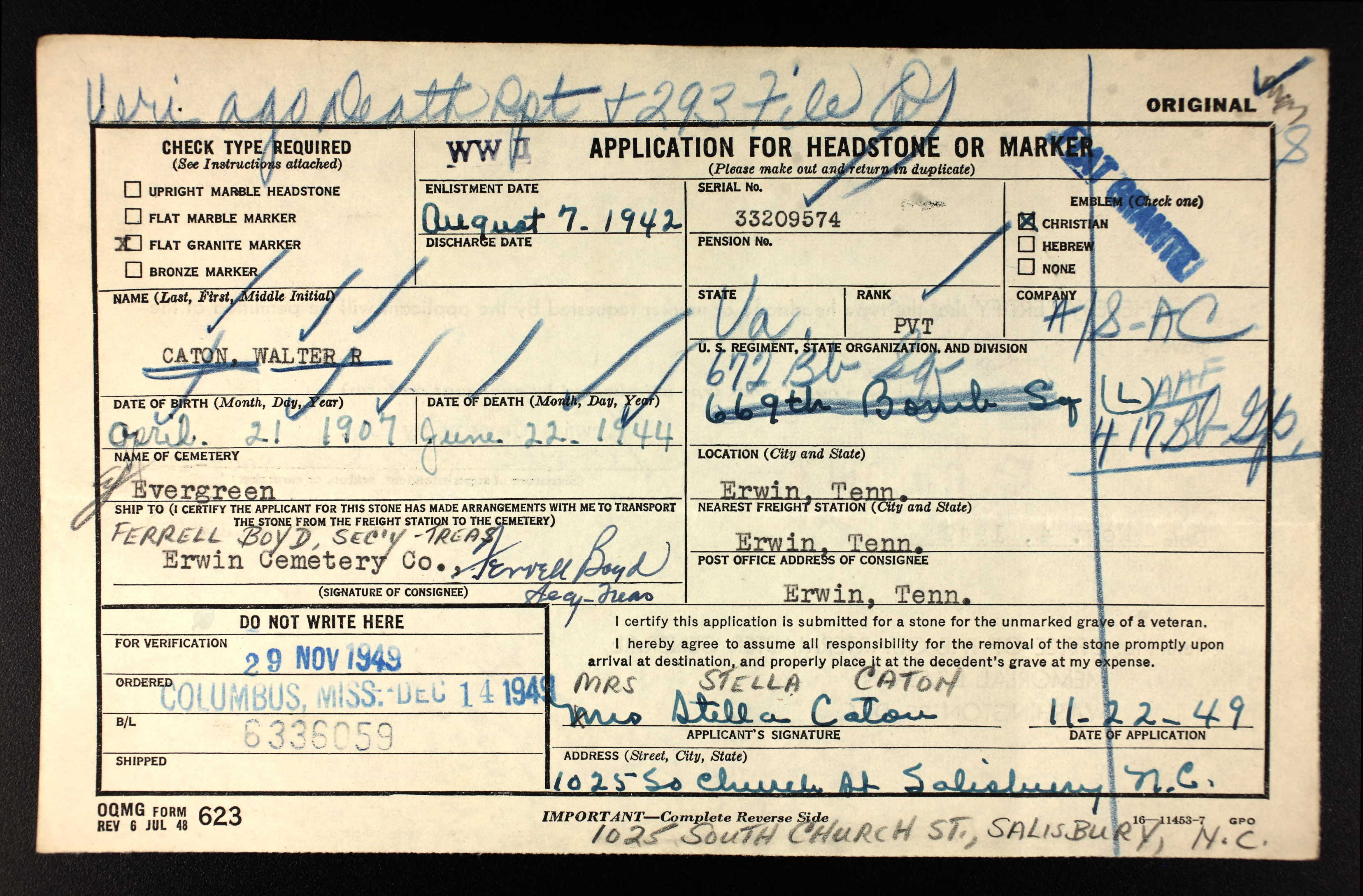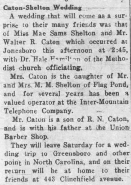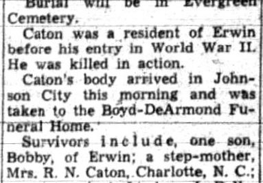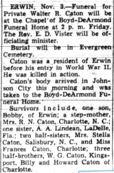 Funeral for Private Walter R. Caton will be at the Chapel of Boyd-DeArmond Funeral Home. Caton’s body arrived in Johnson City this morning. Survivors include, one son, Bobby, of Erwin; a step-mother, Mrs. R.N. Caton, Londean, LaDelle Fla.; two half-sisters, Mrs Stella Caton, Salisbury, N.C., and Miss Frances Caton, Charlotte; three half-brothers, W.G. Caton, Kingsport, Billy and Howard Caton of Charlotte.