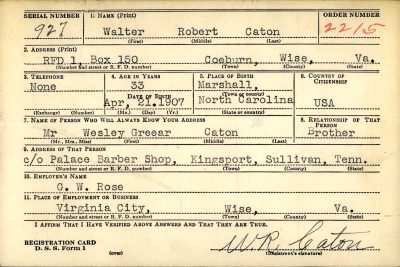 Walter Robert Caton was born on 21 April 1907, the son of Robert Napoleon (Bob) Caton and Lura A. Rector. He married Mae Sams Shelton in 1930 and is the father of Robert Melvyn Caton.