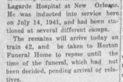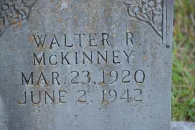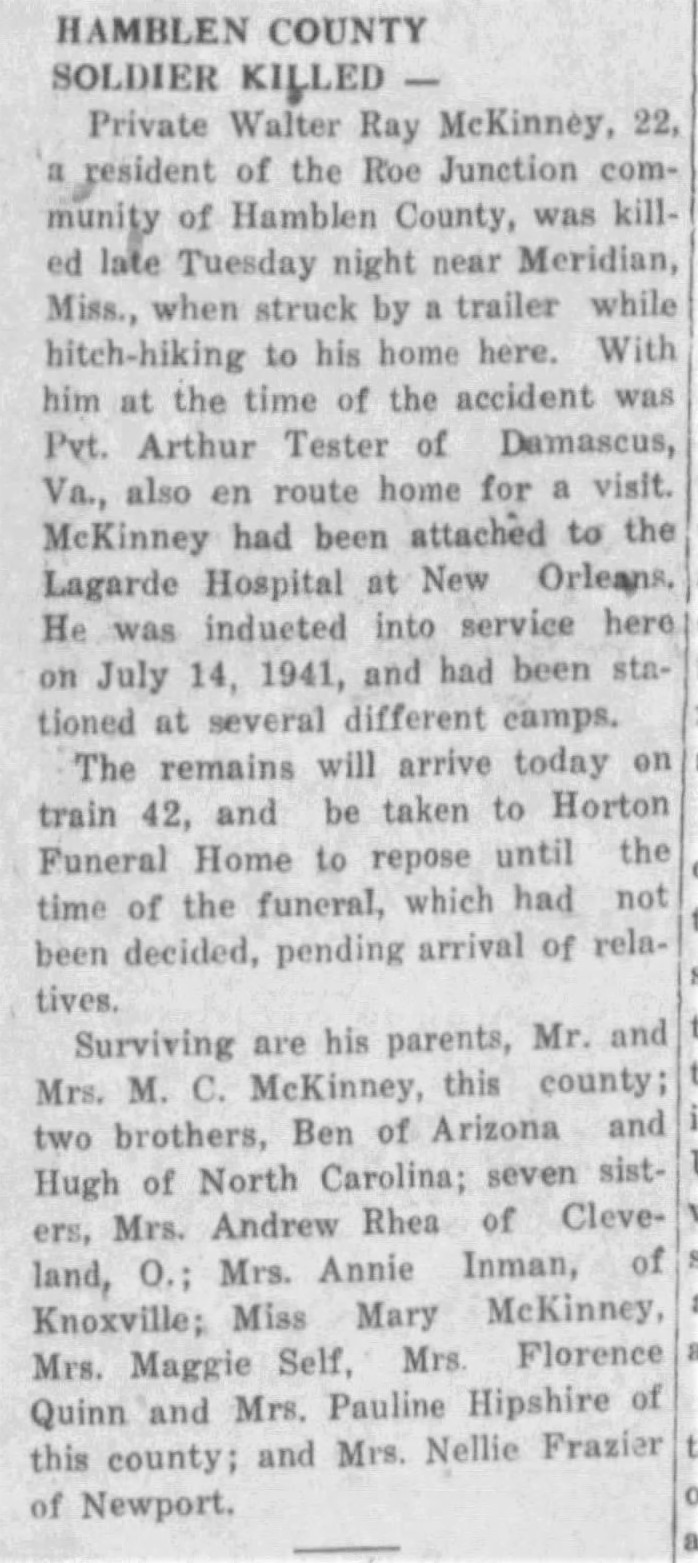 Walter Ray McKinney was born on March 23, 1920, in Morristown, Tennessee, son of John Mack McKinney and Amanda L. (Mandy) Smith. He had three brothers and seven sisters. He was hit and killed on June 2, 1942 by a trailer while hitchhiking in Meridian, Mississippi to his home in Morristown. He was twenty-two.