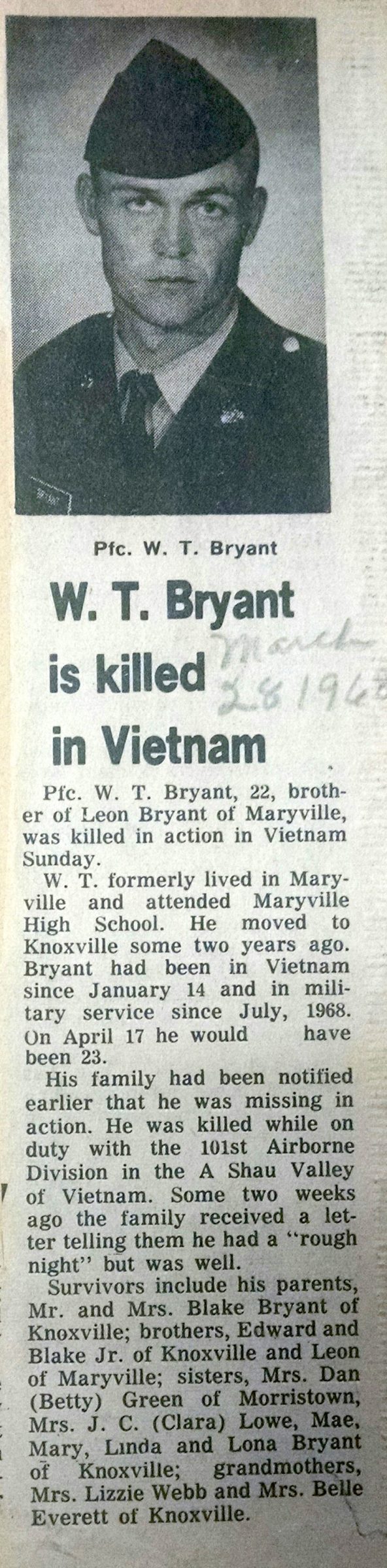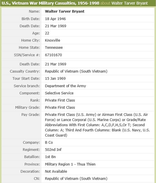 Walter Tarver Bryant was killed in action in Thua Thien Province, South Vietnam.