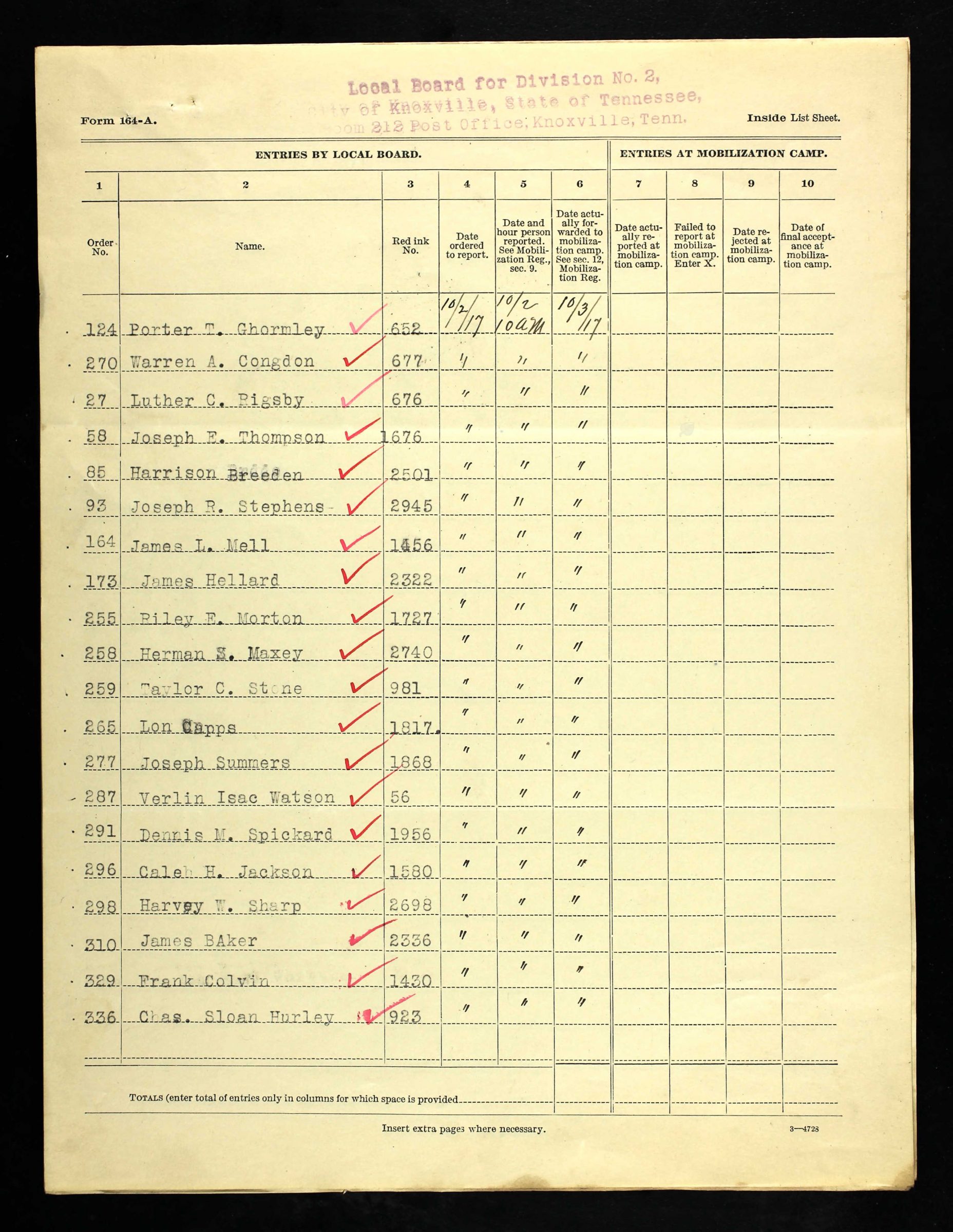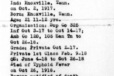 He enlisted in the 105th Sanitary Train, 120th Ambulance Company, 30th Infantry Division, October 5, 1917. After training at Camp Sevier, SC, he went to France, where he served in the Aisne-Marne, Oise-Marne, and Meuse-Argonne Offensives. Sent to base hospital at Langres, France, on October 7 and died there October 26 of typhoid fever.
