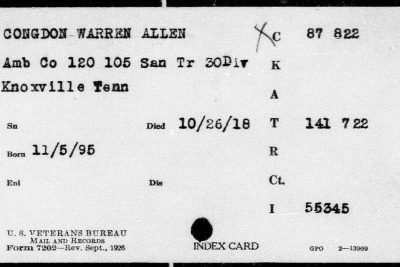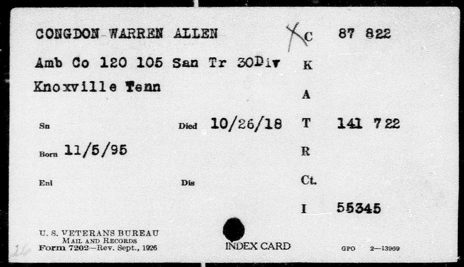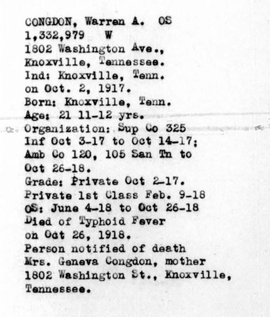 Young Congdon belonged to the 105th Sanitary Train and received his training at Camp Sevier, Greenville, S.C. He has been in France several months. Recently his parents received a letter from their son’s commander, Capt. Dabney, in which he spoke of the illness of their son, of the high esteem in which the officer and all his comrades held Young Congdon and stated that he had been sent to the best available hospital, where Capt. Dabney was confident the young soldier would recover.