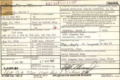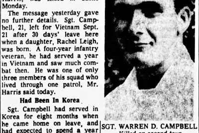 The Silver Star citation stated that Sgt. Warren D. Campbell distinguished himself by exceptionally valorous action. When his unit came under intense hostile fire and his Squad sustained casualties, Sgt. Campbell immediately directed his squad to take cover behind a dike. Spotting several of his comrades lying in an exposed area, Sgt. Campbell disregarding his own safety, left his covered position, and exposed himself to enemy fire as he attempted to reach the wounded soldiers. At this time he was mortally wounded. At the time of his death Staff Sergeant Campbell was with Company D, 5th Battalion, 7th Cavalry Regiment, 1st Cavalry Division.