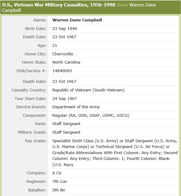 Warren Dane Campbell was born September 23, 1946 in Cherryville, Gaston County, North Carolina to Leonard Calvert “L.C.” Campbell and Evelyn Owens Campbell. He enlisted in the US Army from Tennessee.