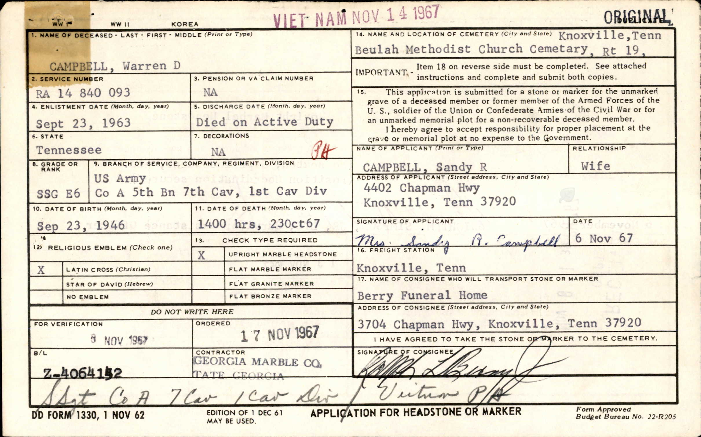 Warren Dane Campbell was born September 23, 1946 in Cherryville, Gaston County, North Carolina to Leonard Calvert “L.C.” Campbell and Evelyn Owens Campbell. He enlisted in the US Army from Tennessee.