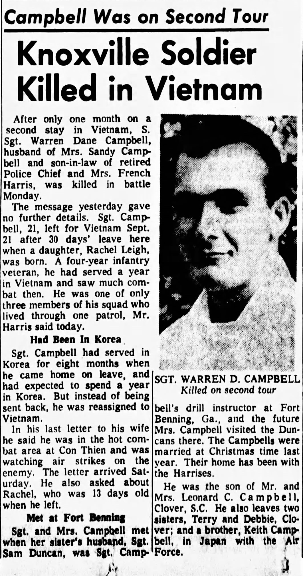 The Silver Star citation stated that Sgt. Warren D. Campbell distinguished himself by exceptionally valorous action. When his unit came under intense hostile fire and his Squad sustained casualties, Sgt. Campbell immediately directed his squad to take cover behind a dike. Spotting several of his comrades lying in an exposed area, Sgt. Campbell disregarding his own safety, left his covered position, and exposed himself to enemy fire as he attempted to reach the wounded soldiers. At this time he was mortally wounded. At the time of his death Staff Sergeant Campbell was with Company D, 5th Battalion, 7th Cavalry Regiment, 1st Cavalry Division.