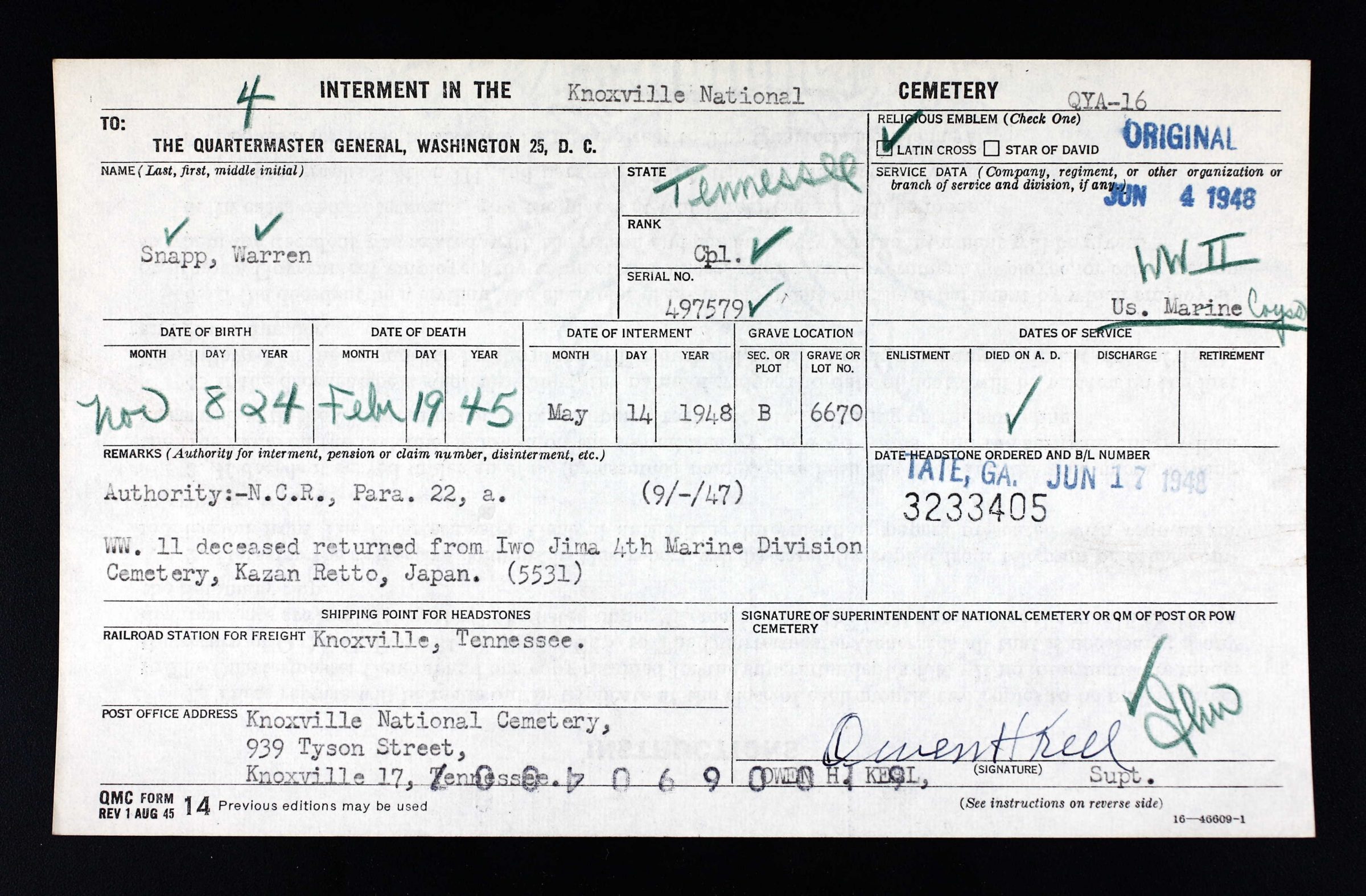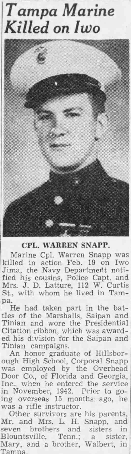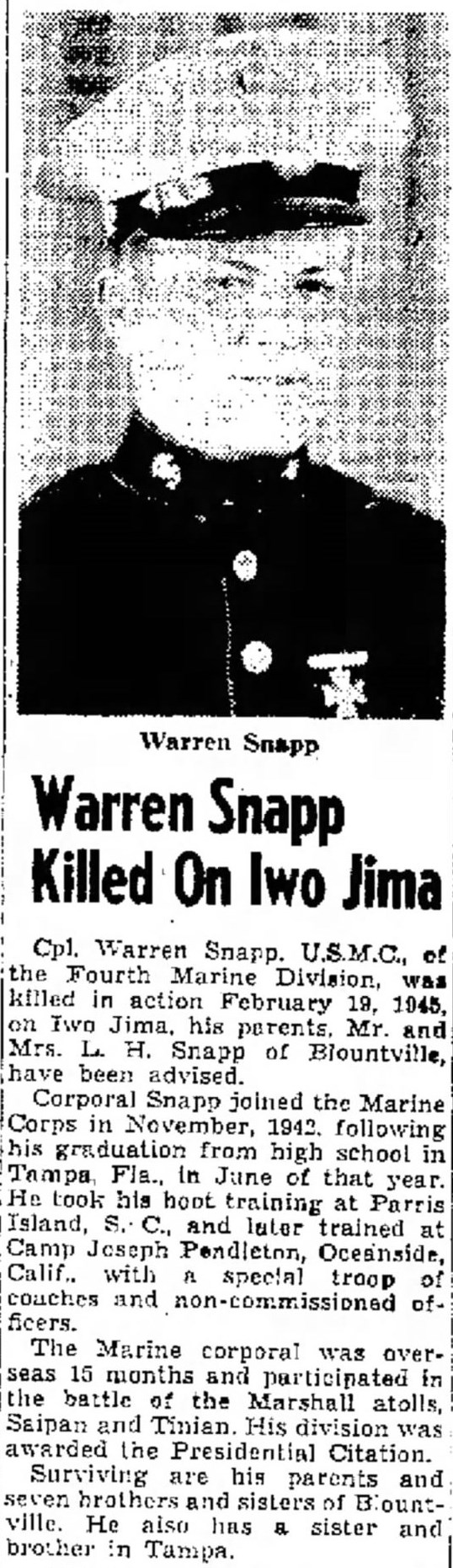 Cpl. Warren Grant Snapp, USMC, of the Fourth Marine Division, was killed in action February 19, 1945, on Iwo Jima, his parents, Mr. and Mrs. L.H. Snapp of Blountville, have been advised.