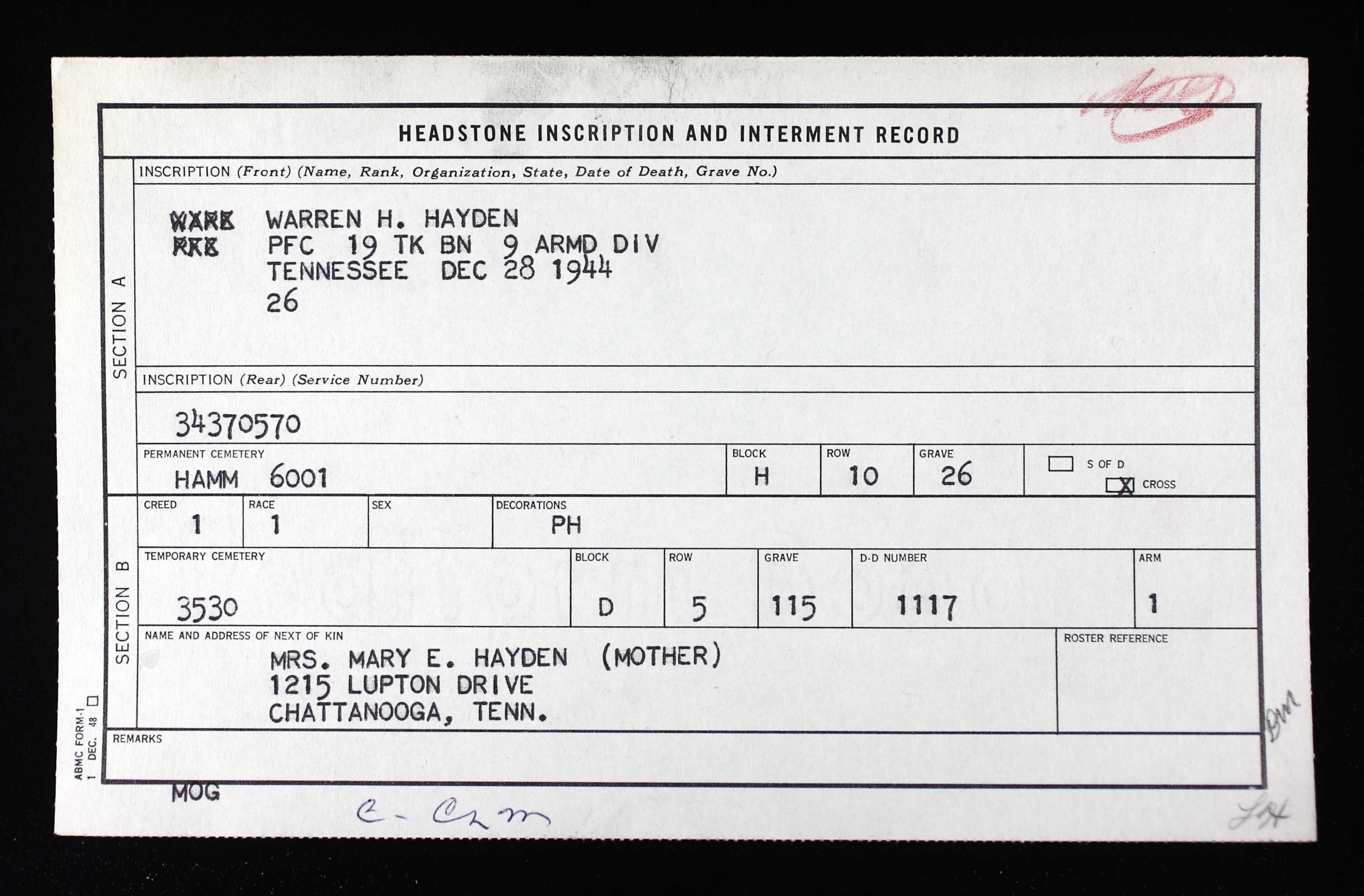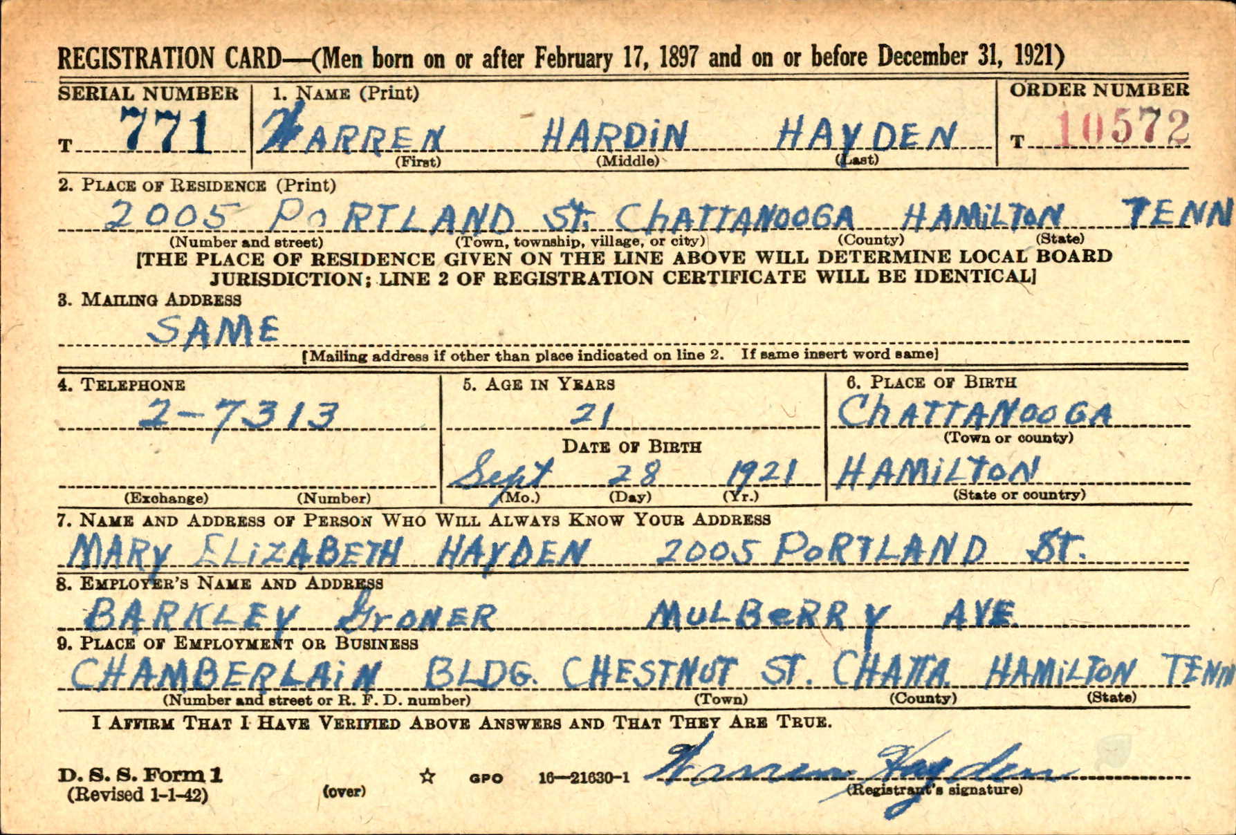 Warren Hardin Hayden was born at Chattanooga, Tennessee, the son of George William Hayden and Mary Elizabeth Gilliam.