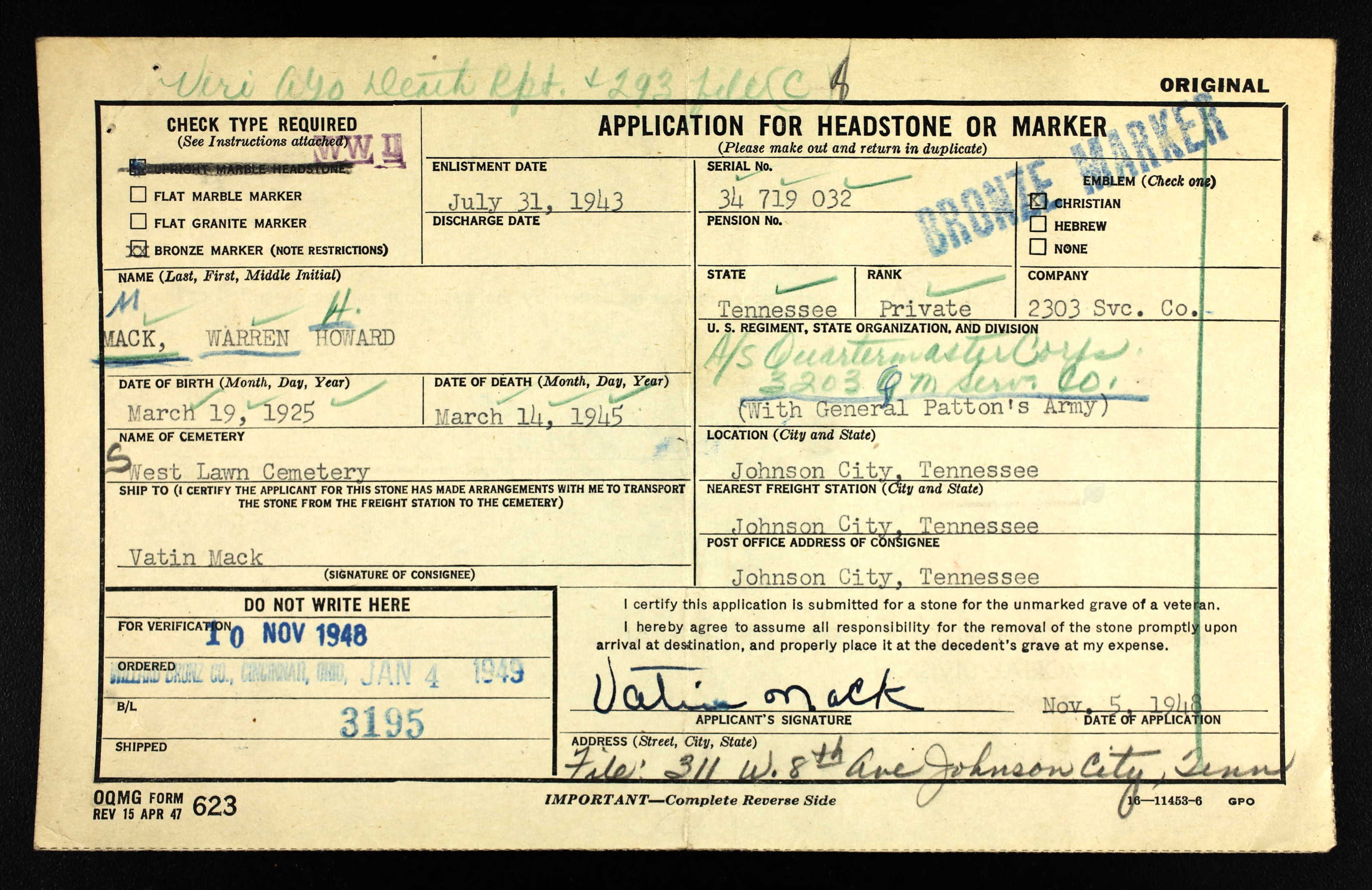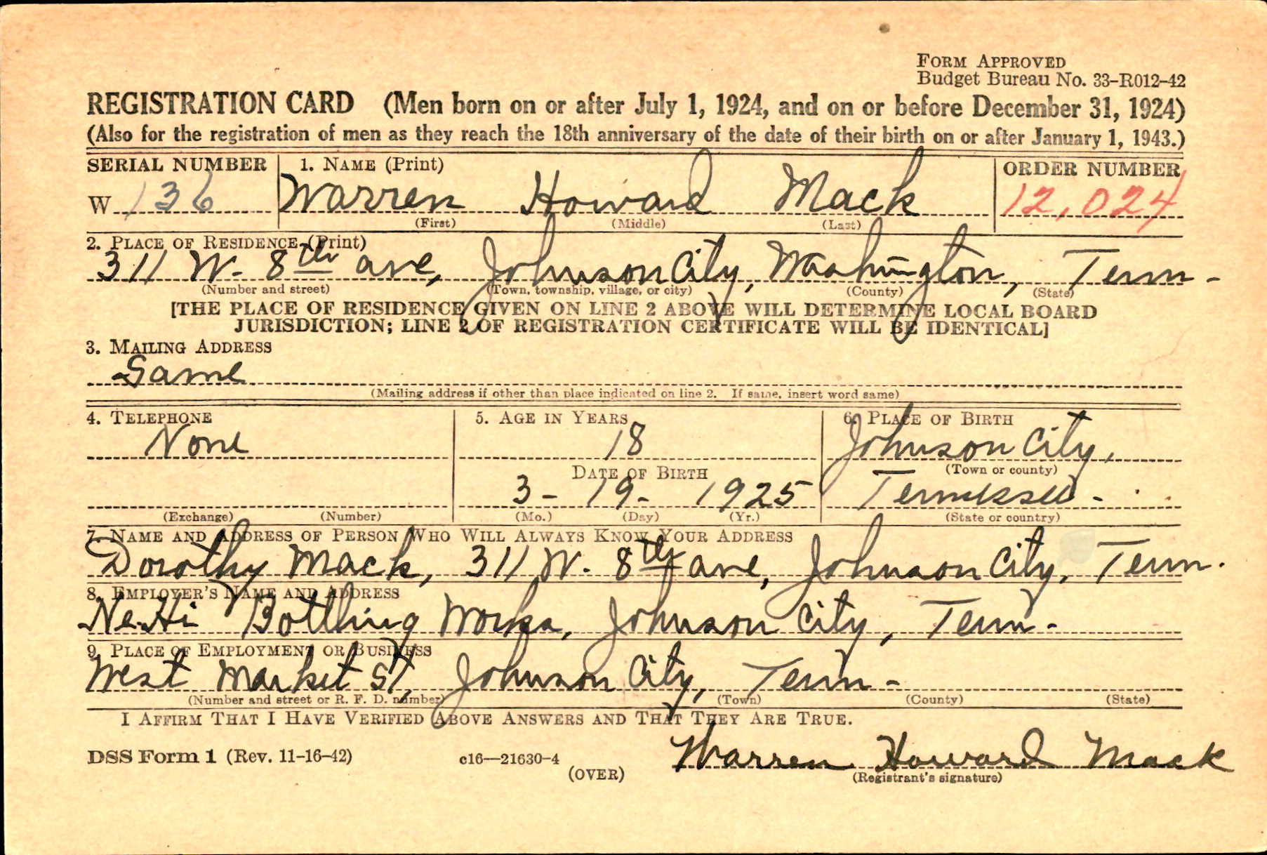 Warren Howard Mack was born in Johnson City, Washington County, Tennessee on 19 March 1925. He was the son of Vatin Mack and Dorothy Ann Brown, an ordained minister. Vatin was a veteran of World War I having served with the United States Army. Dorothy ministered at the New Mt. Hope Fire Baptized Holiness Church just down West Eighth Avenue where they lived and Warren grew up.