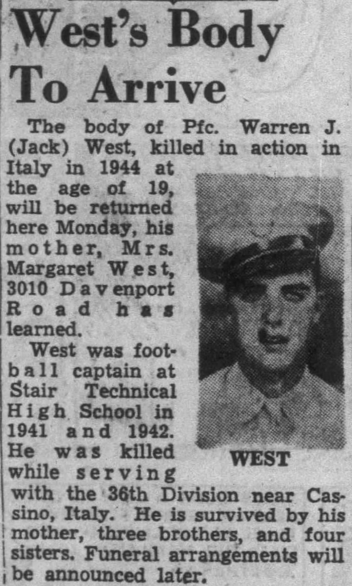 The body of Pfc. Warren J. (Jack) West, killed in action in Italy in 1944 at the age of 19, will be returned here, his mother Mrs. Margaret West, 3010 Davenport Road has learned. He was killed while serving with the 36th Division near Cassino, Italy.