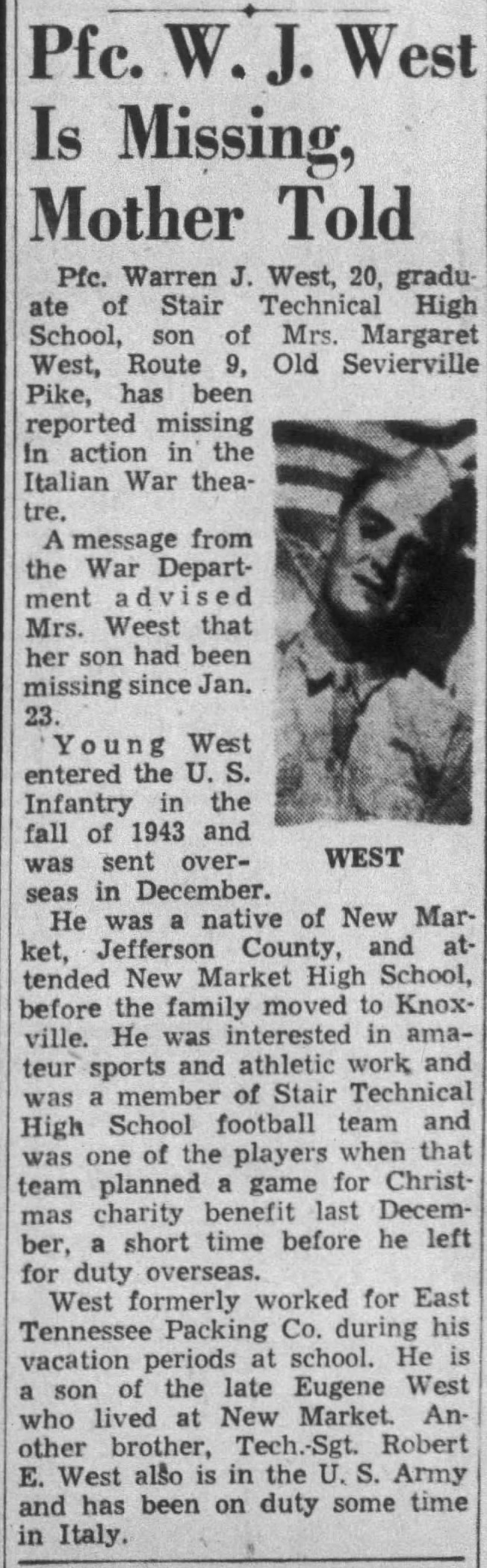 Young West entered the U.S. Infantry in the fall of 1943 and was sent overseas in December. He was a native of New Market, Jefferson County and attended New Market High School, before the family moved to Knoxville. He was interested in amateur sports and athletic work and was a member of Stair Technical High School football team and was one of the players when that team planned a game for Christmas charity benefit last December, a short time before he left for duty overseas. West formerly worked for East Tennessee Packing Co. during his vacation periods at school. He is a son of the late Eugene West who lived at New Market. Another brother, Tech. Sgt. Robert E. West also is in the U.S. Army and has been on duty some time in Italy.