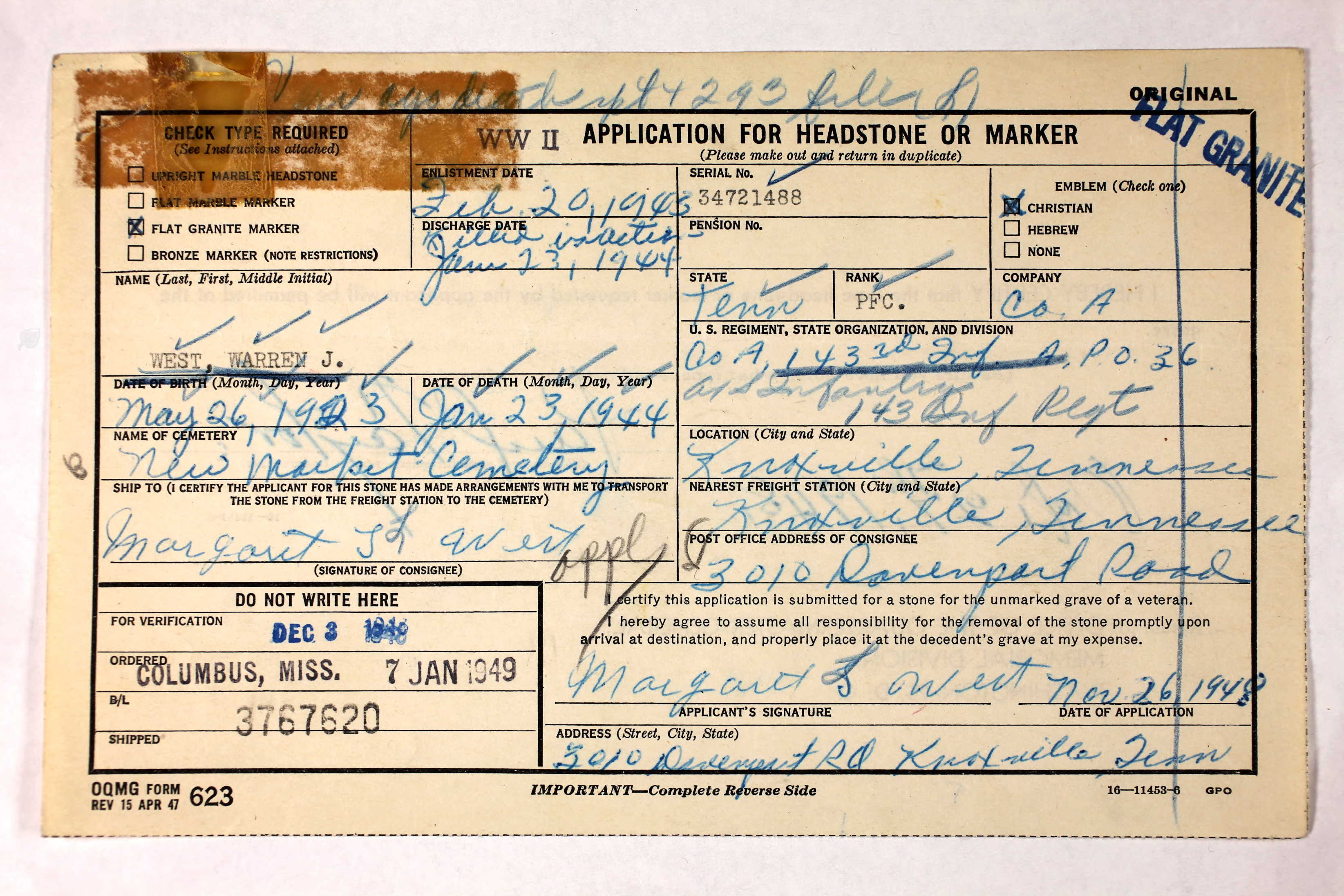 Pfc. West was repatriated to the United States after the war and funeral services were held at Berry Funeral Home Chapel on September 29, 1948. He was buried at Presbyterian Cemetery, New Market, TN.