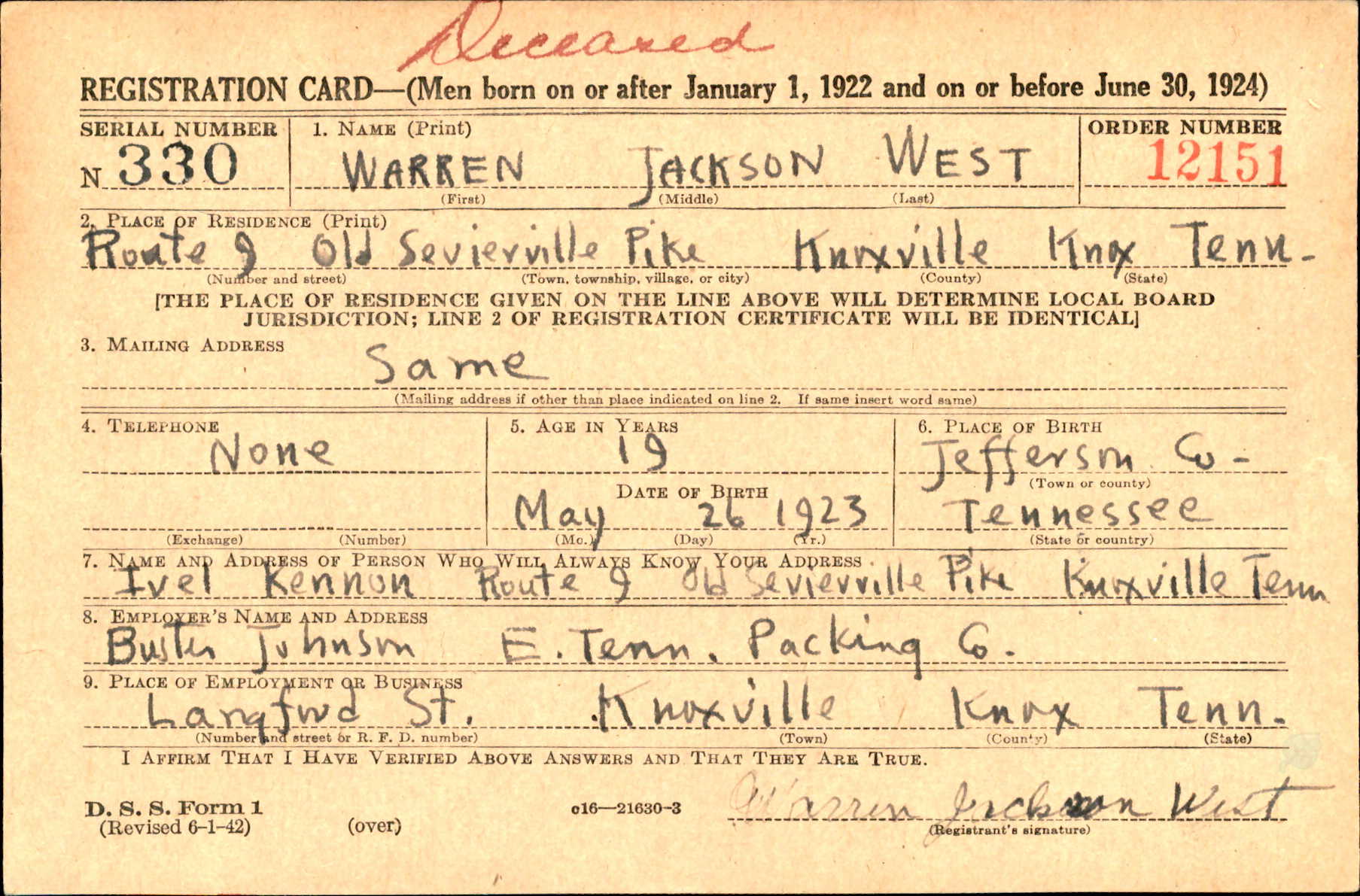Warren Jackson West was born on 26 May 1923 in Jefferson County, Tennessee. He was the son of Eugene West and Margaret Lloyd.